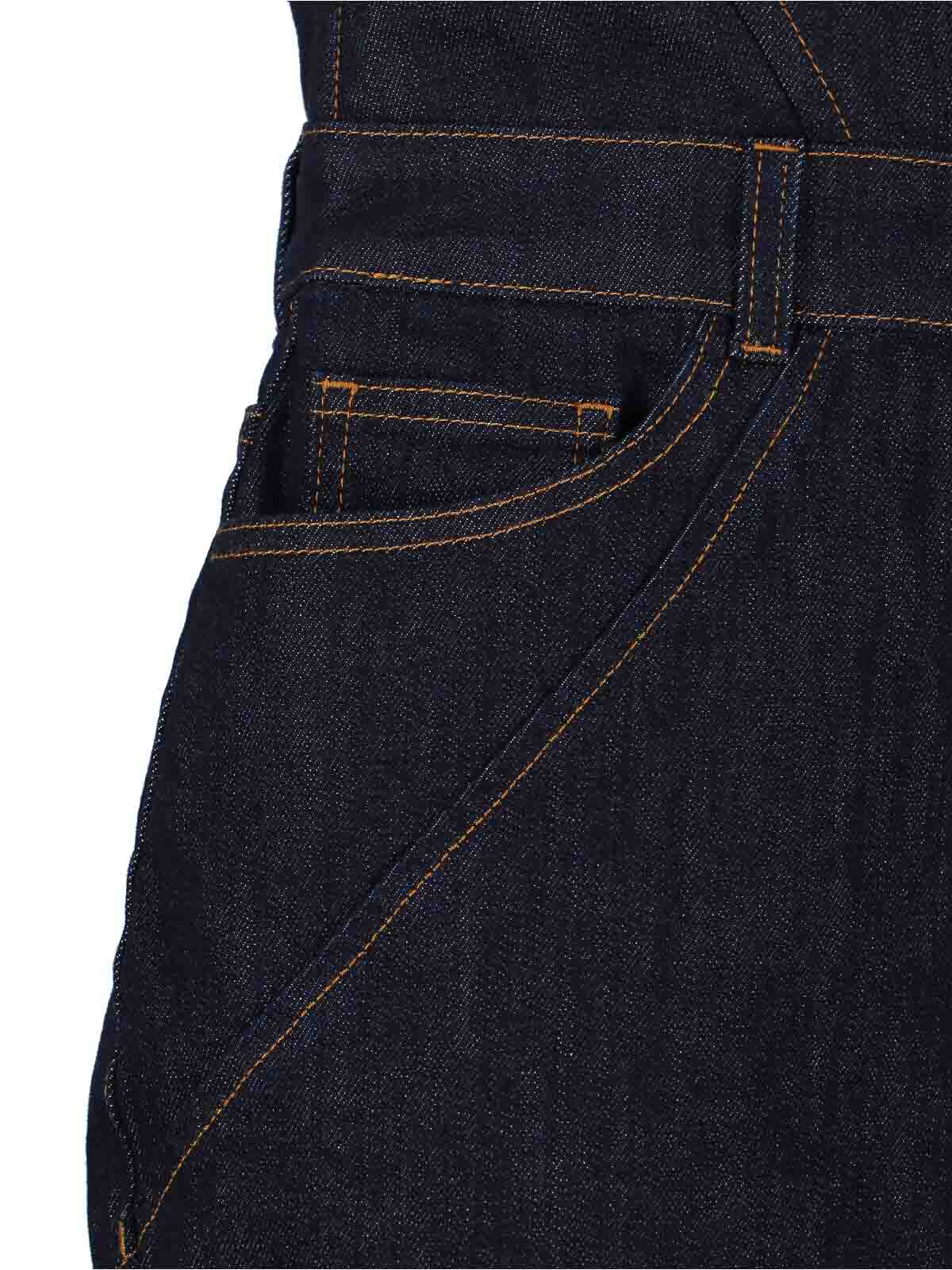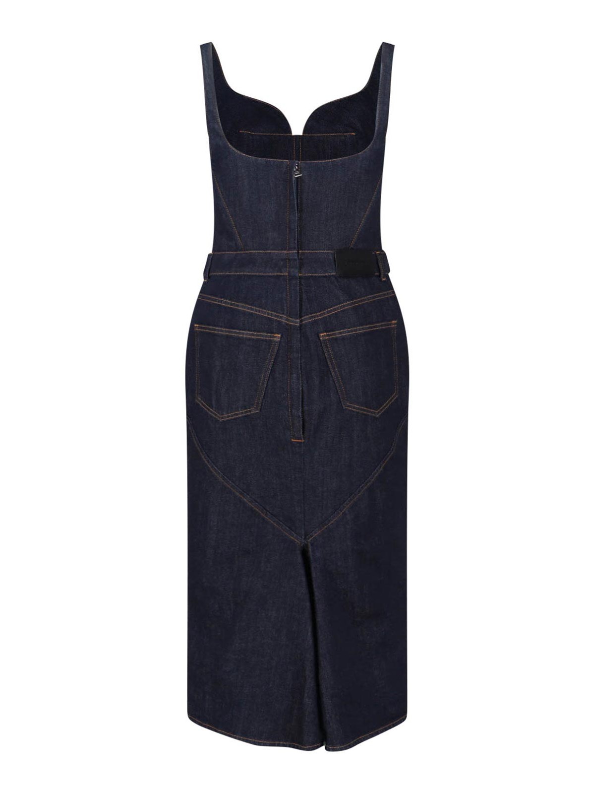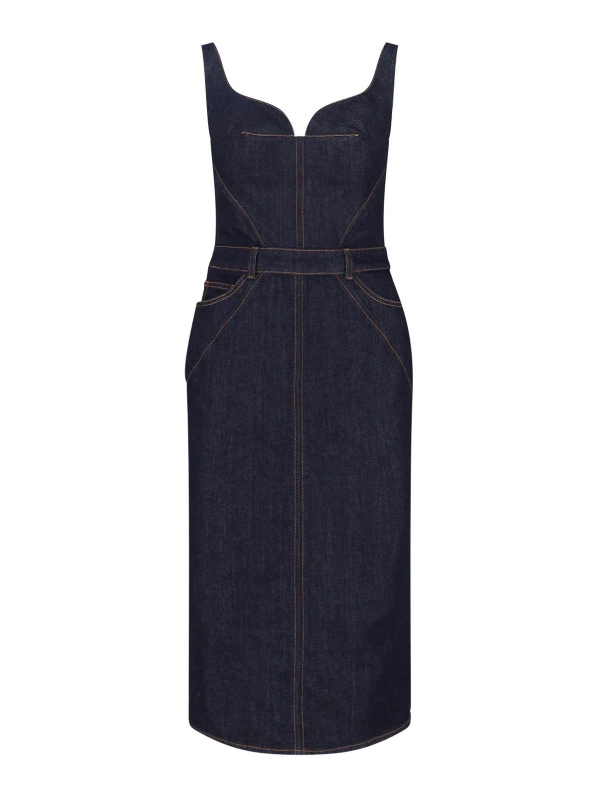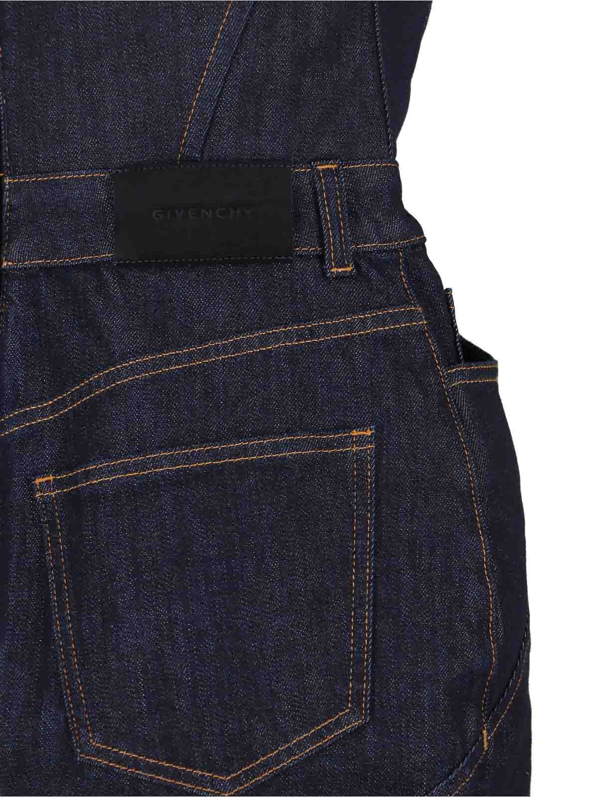 Givenchy Kickback-Midikleid aus blauem Baumwolldenim, dunkler Ton, dünne Träger, Herzausschnitt, Reißverschluss am Rücken, Gürtelschlaufen, Design mit fünf Taschen, Logo-Patch auf der Rückseite, geschwungener Saum.