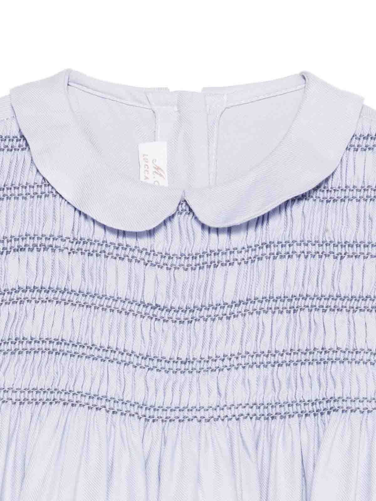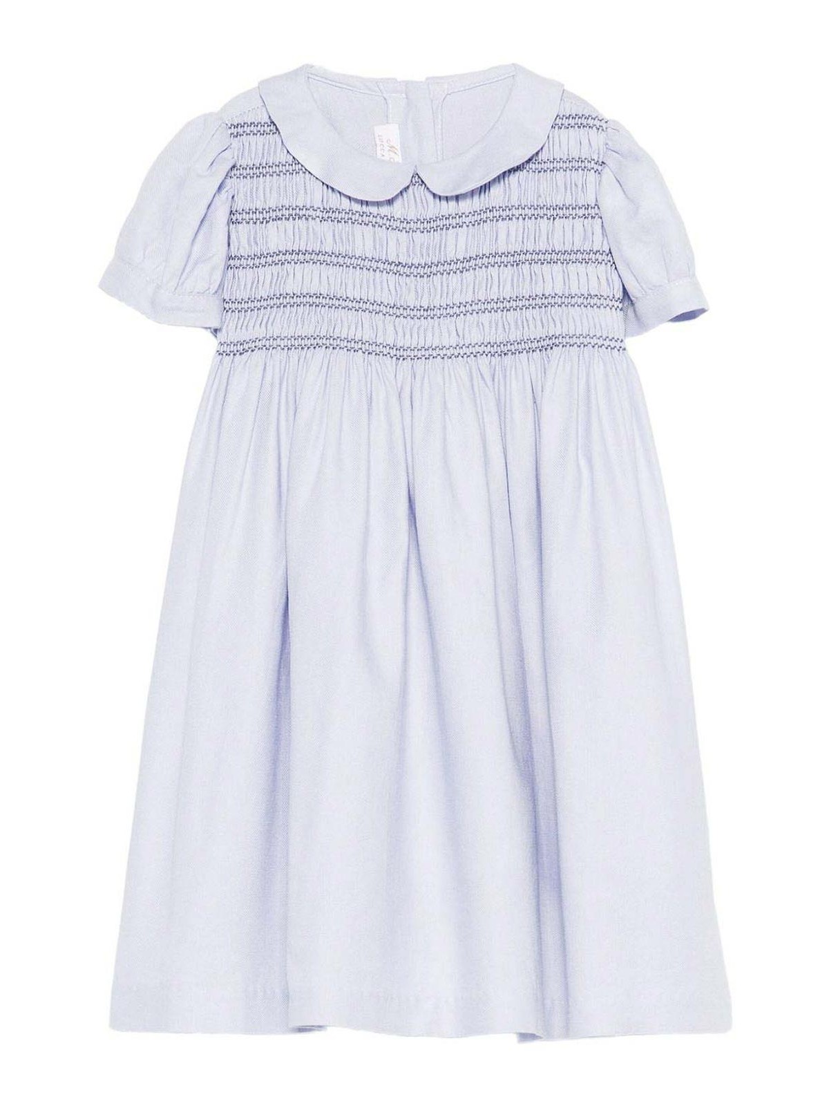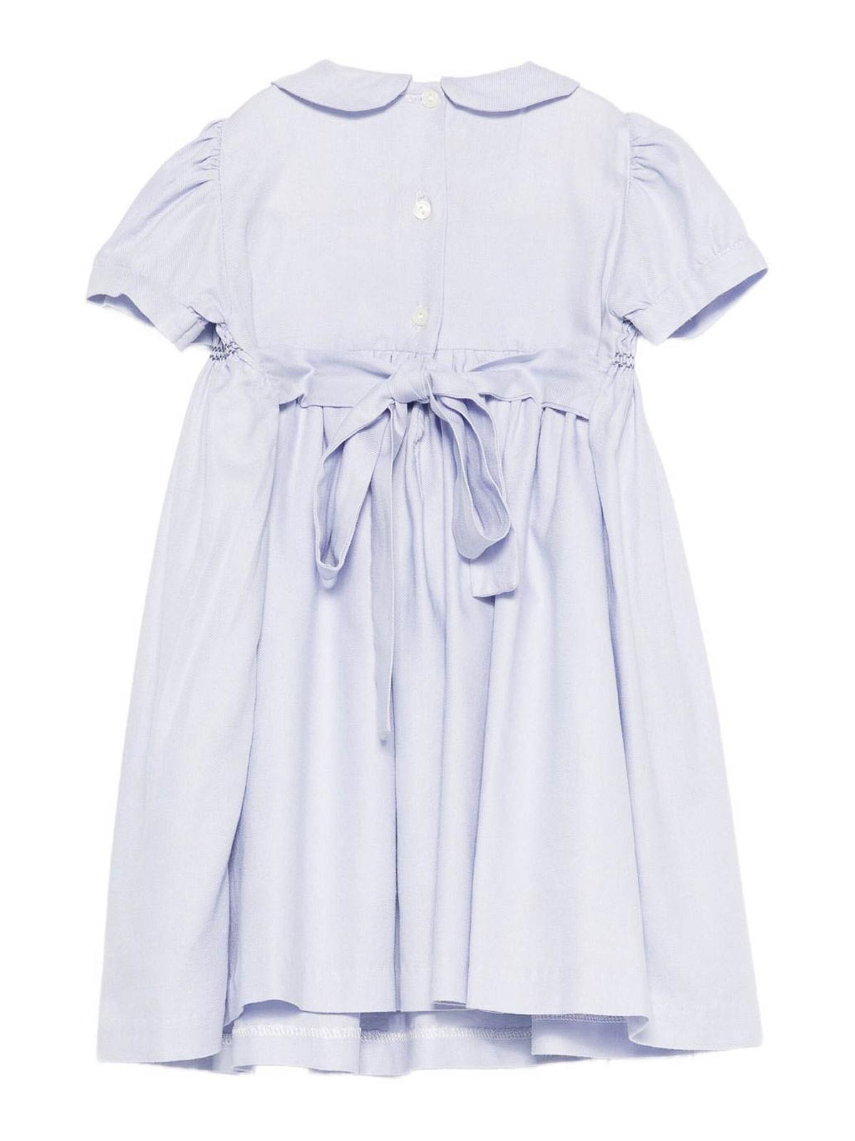 Das Kleid mit Peter-Pan-Kragen verfügt über ein hellblaues, gesmoktes Korsett mit kurzen Ärmeln und geknoteten Rückenknöpfen