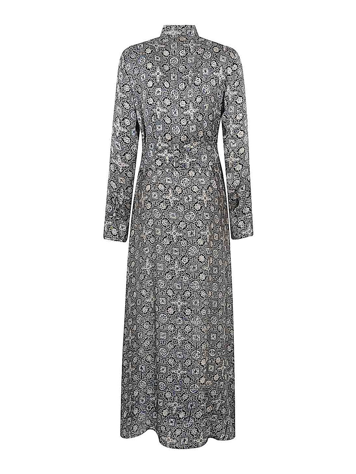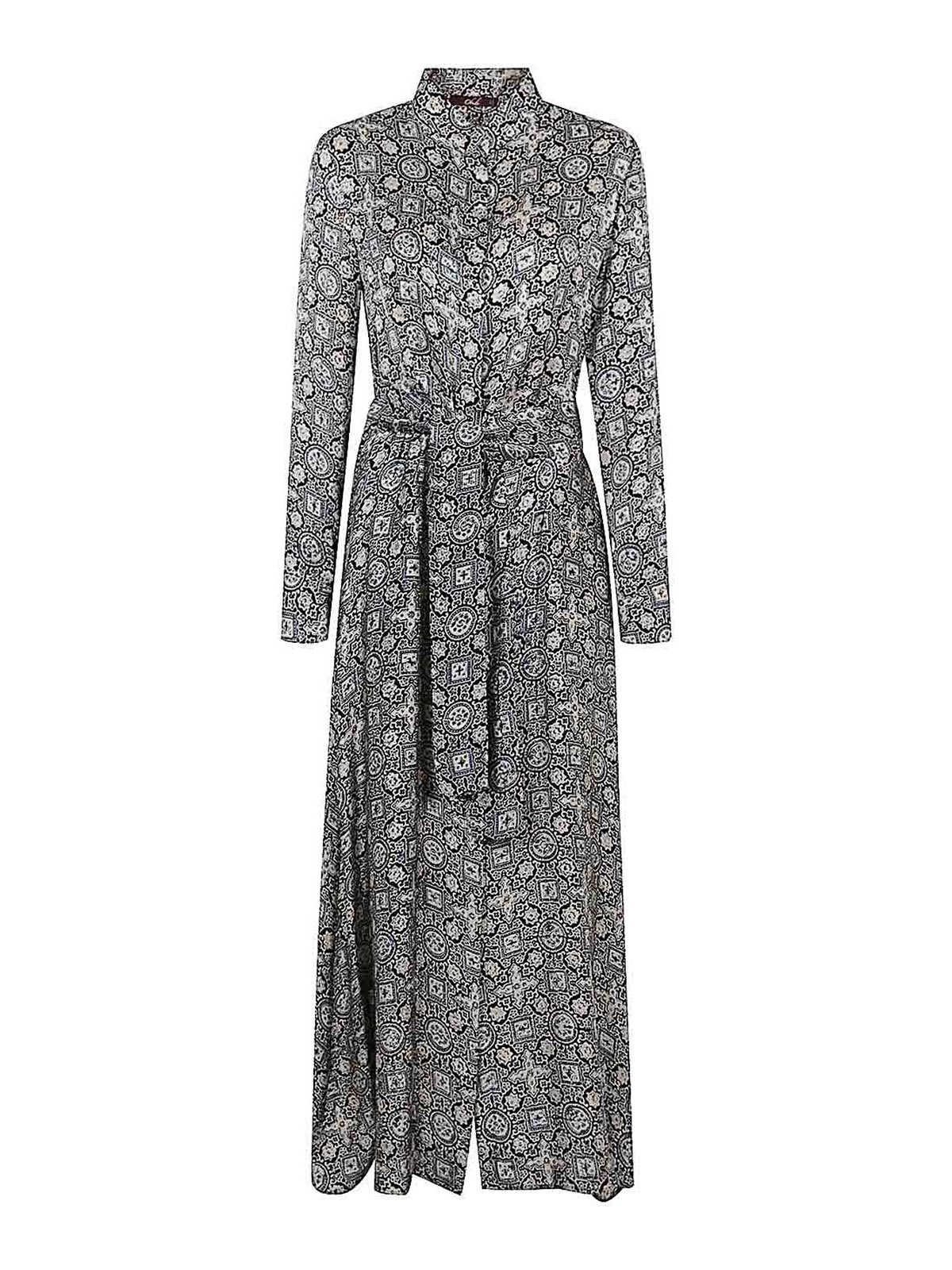 Blaues Kleid, mit verstellbarem und abnehmbarem Gürtel, langen Ärmeln, Rundhalsausschnitt, Knopfverschluss vorne.