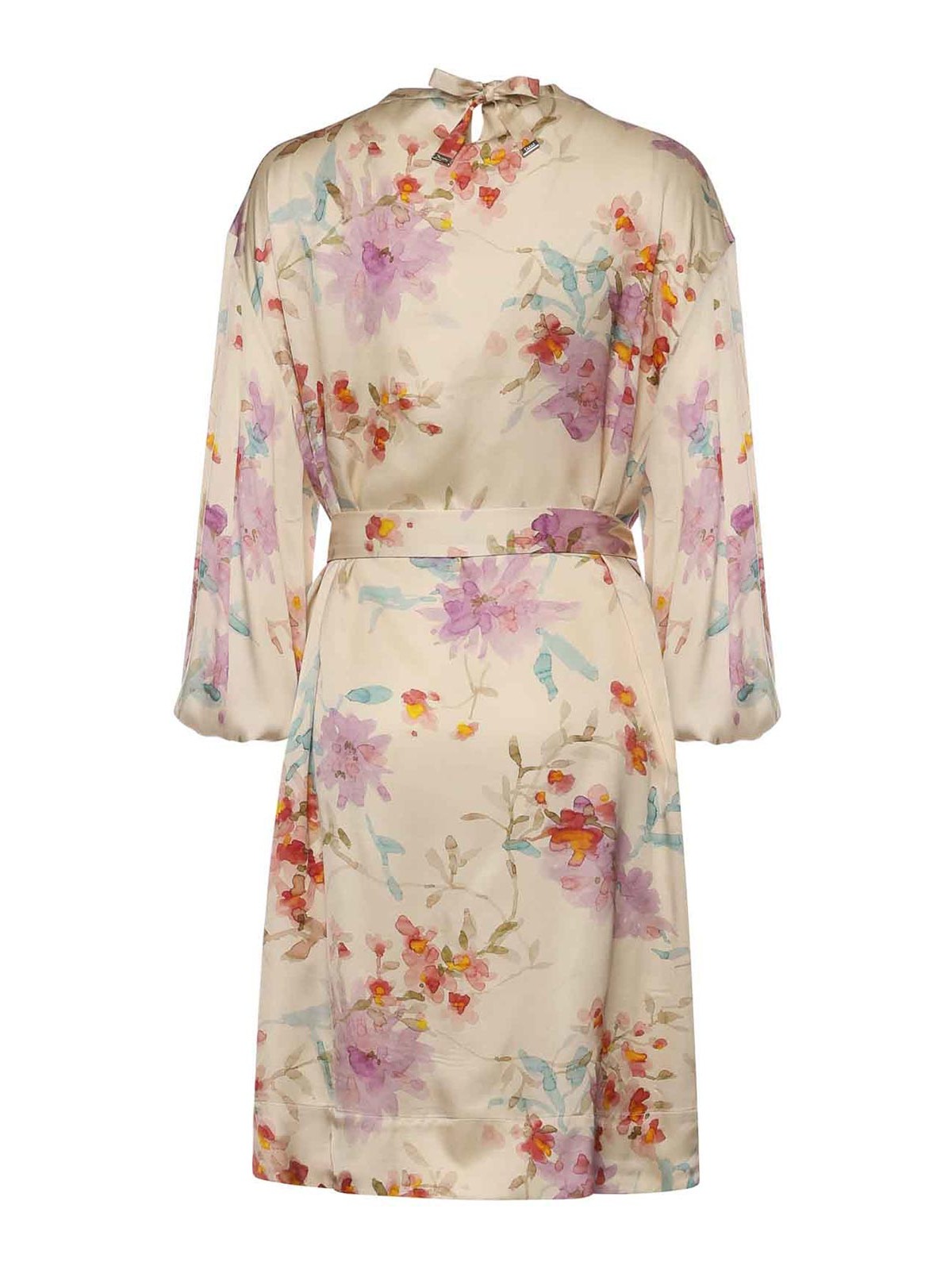 gefertigt aus glänzendem Satin, Rundhalsausschnitt, farblich abgestimmter Taillengürtel, lange Ärmel, lockere Passform, abgebildete Größe ist 40, hergestellt in Italien, Farbe: mehrfarbig
