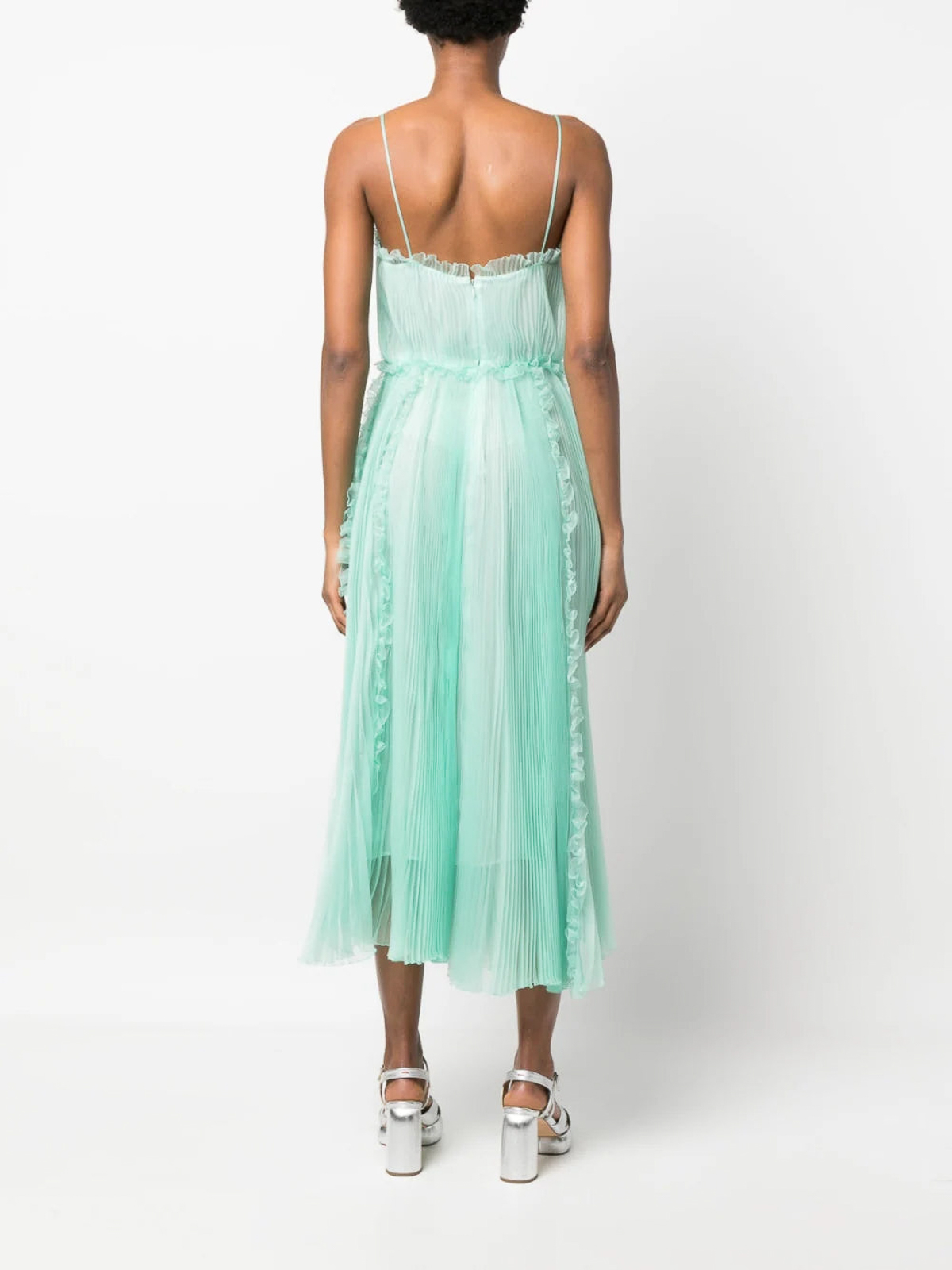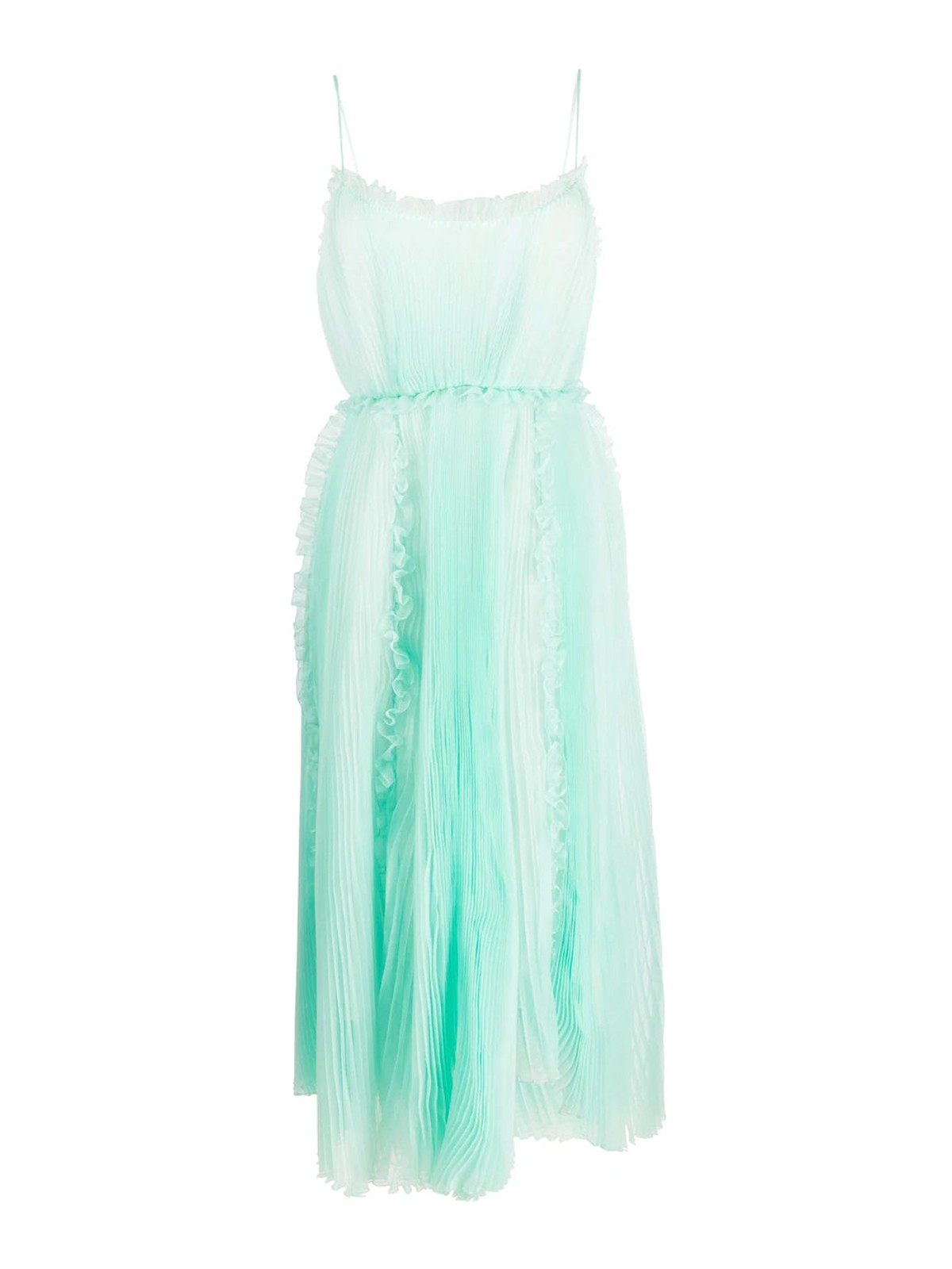 gletschergrünes Seidengemisch mit Rüschenbesatz, vollständig plissierten Spaghettiträgern, halbtransparenter Overlay, mittellang