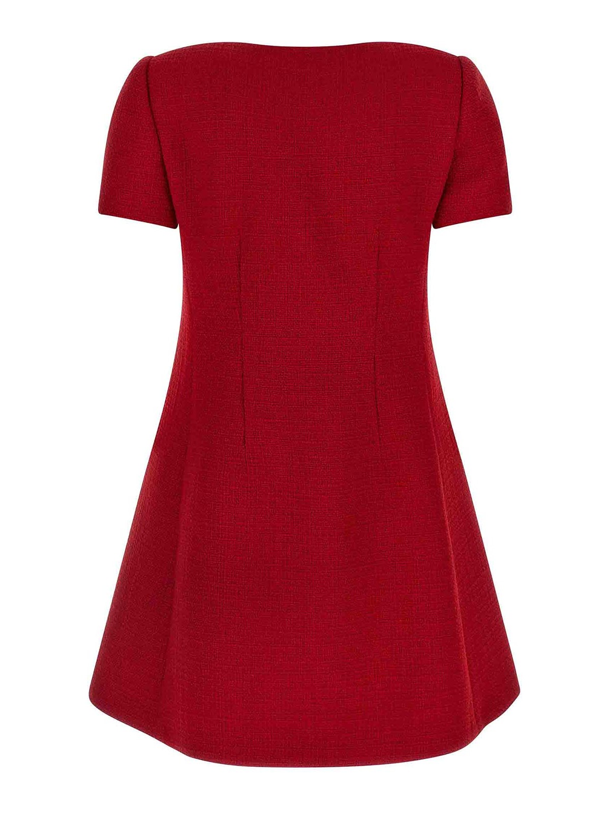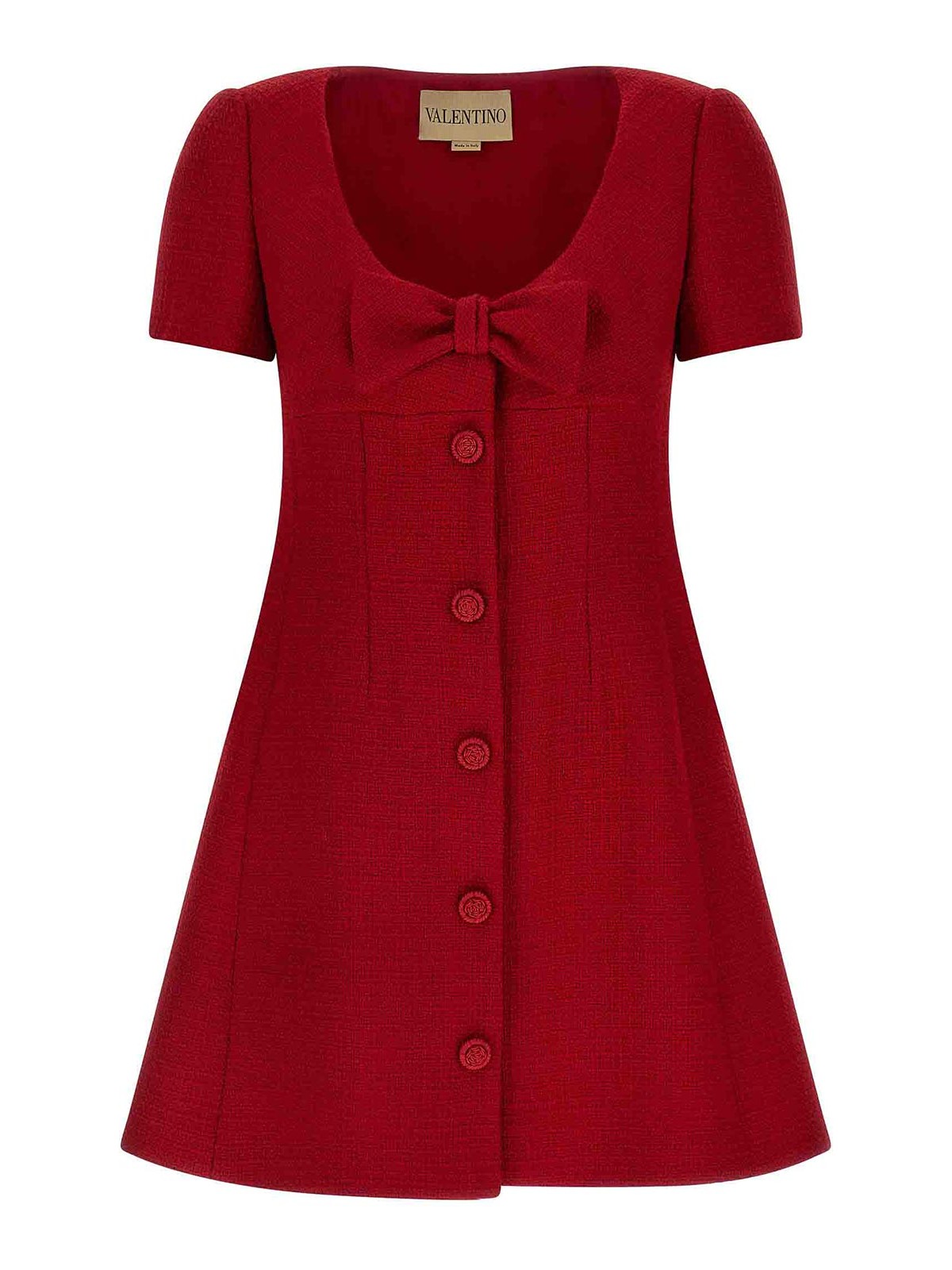 Schlichtes Minikleid aus Wolltweed, breiter Rundhalsausschnitt vorne mit farblich abgestimmtem Schleifendetail, ausgestellter Silhouette, Knopfverschluss mit Soutache-Knöpfen, kurze Ärmel, Jacquard-Futter mit Fiore Vlogo.