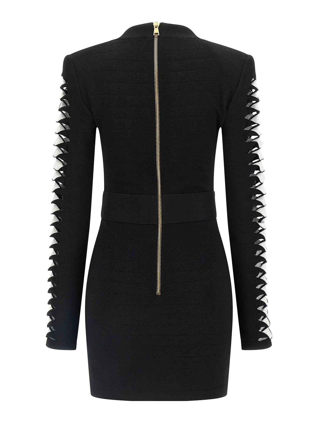 Minikleid aus Stretchmix mit Schnitt, Raus und Umschlag, Hochtouren an den Ärmeln, gepolsterte Schultern, tiefes V, Ausschnitt, Rücken, Reißverschluss, lange Ärmel, ungefüttert