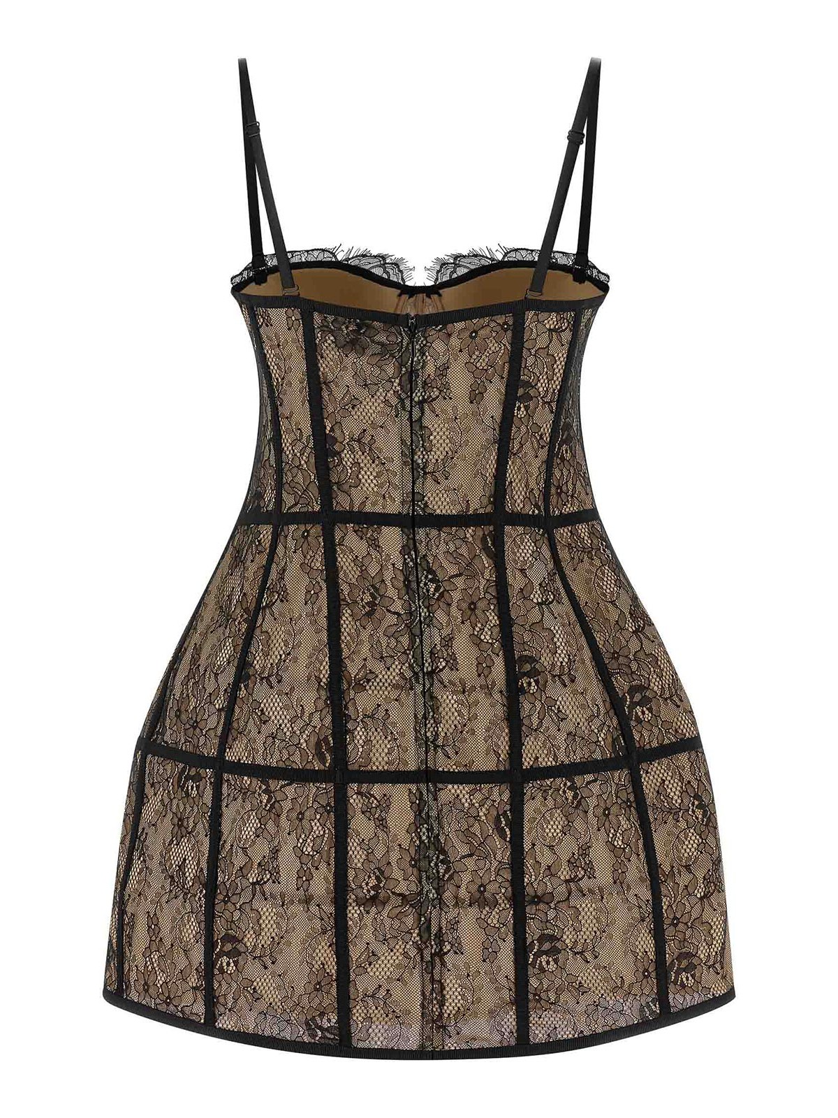 Minikleid aus Spitze mit kontrastierenden Ripsmustern, steifer schulterfreier Bustier-Stil mit vorgeformten Körbchen und inneren Latten, dünnen verstellbaren und abnehmbaren Trägern, ärmellos, Reißverschluss am Rücken, Futter.