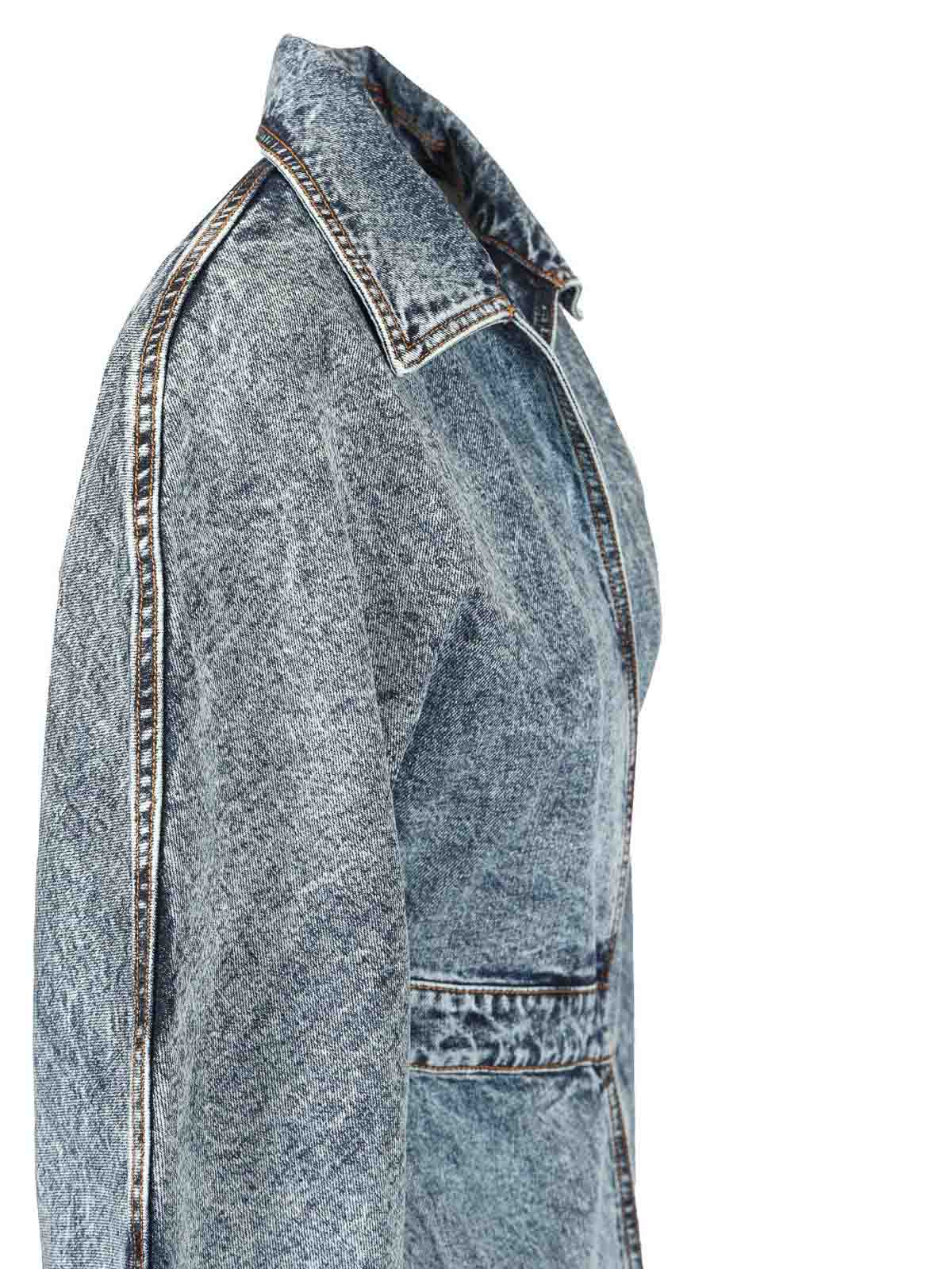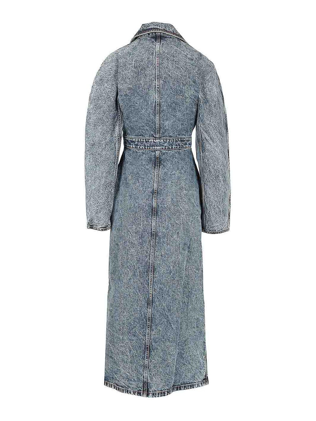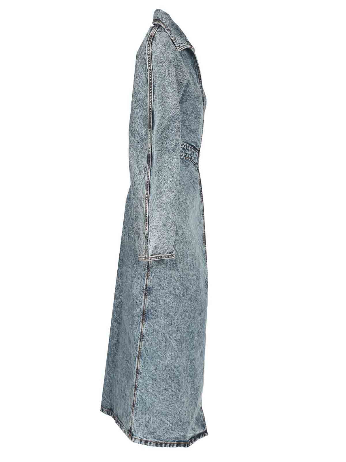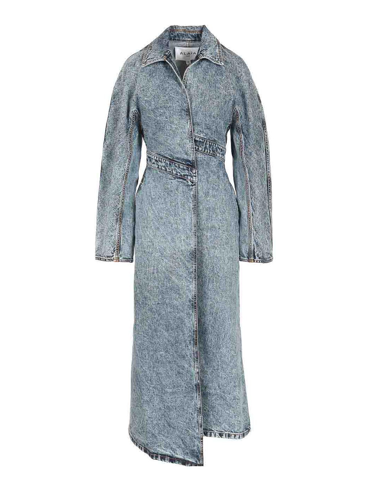 Trenchcoat aus Denim im Stonewash-Design von alaia mit folgenden Eigenschaften: eng anliegender Bund, offener Kragen, mittellanger Schnitt, asymmetrischer Saum und integrierter Spiralgürtel.