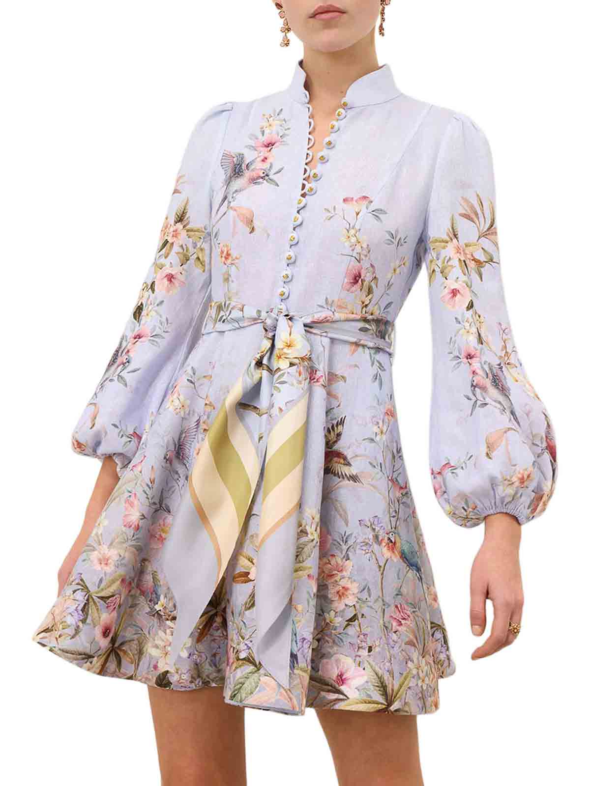 Minikleid Rebellion mit Knöpfen, 100% Leinen, Stehkragen, Rouleau-Knöpfe auf der Vorderseite des Mieders, Druck, abnehmbarer Schalgürtel, verdeckter Reißverschluss hinten in der Mitte, langer ausgestellter Rock, Farbe: Volierenblau