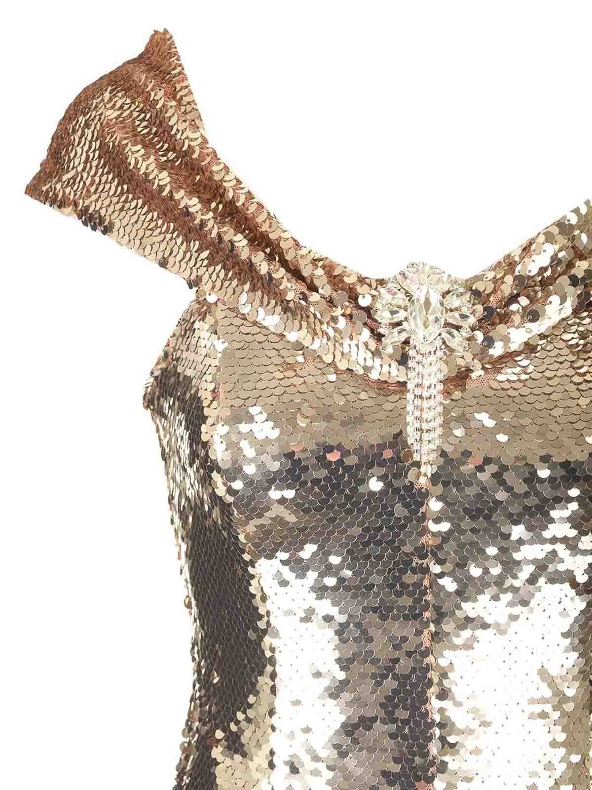 Schulterfreies Kleid mit goldfarbenen Pailletten von Self Portrait mit ausgestelltem Rock, diamantenfarbenem Broschendetail, taillierter Schnitt, Reißverschluss am Rücken, internes Korsett.