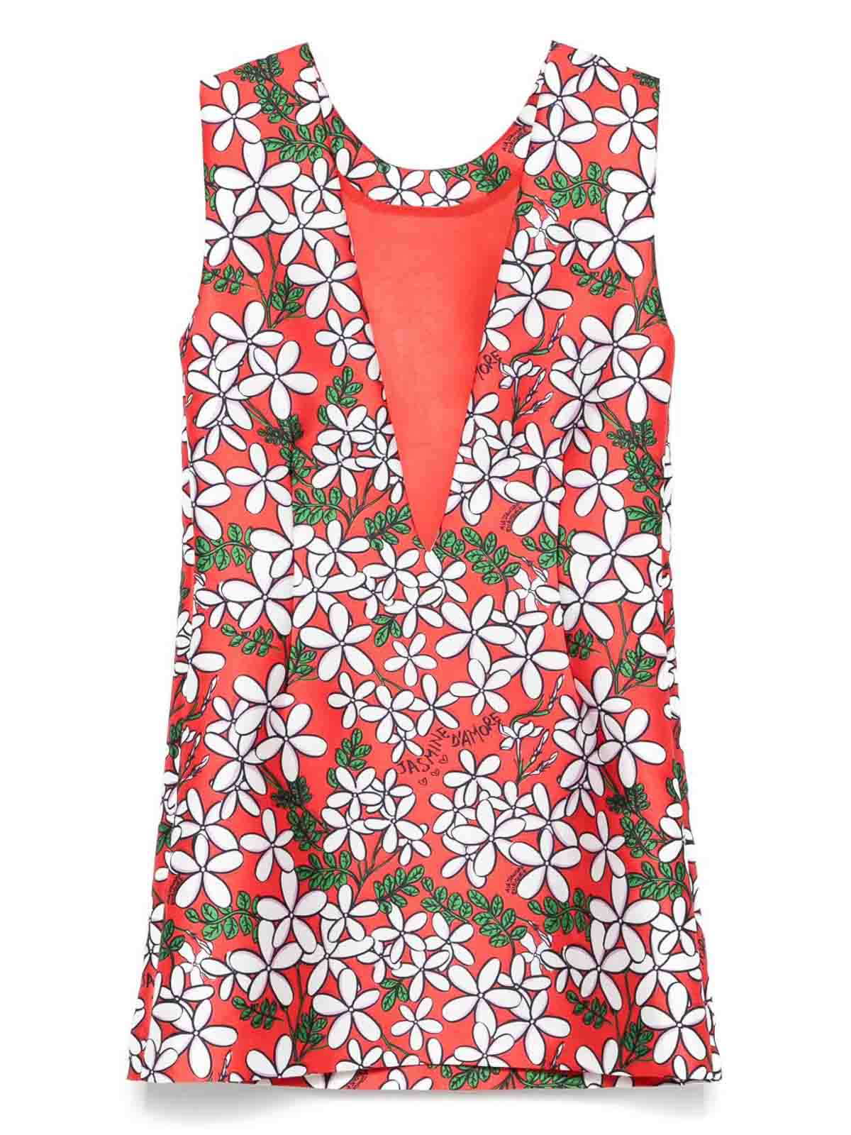 Hergestellt aus leichter Viskose und Seide, durchgehender Gänseblümchenprint, Rundhalsausschnitt vorne und V-Ausschnitt hinten, ärmelloses Design, integriertes Innenfutter