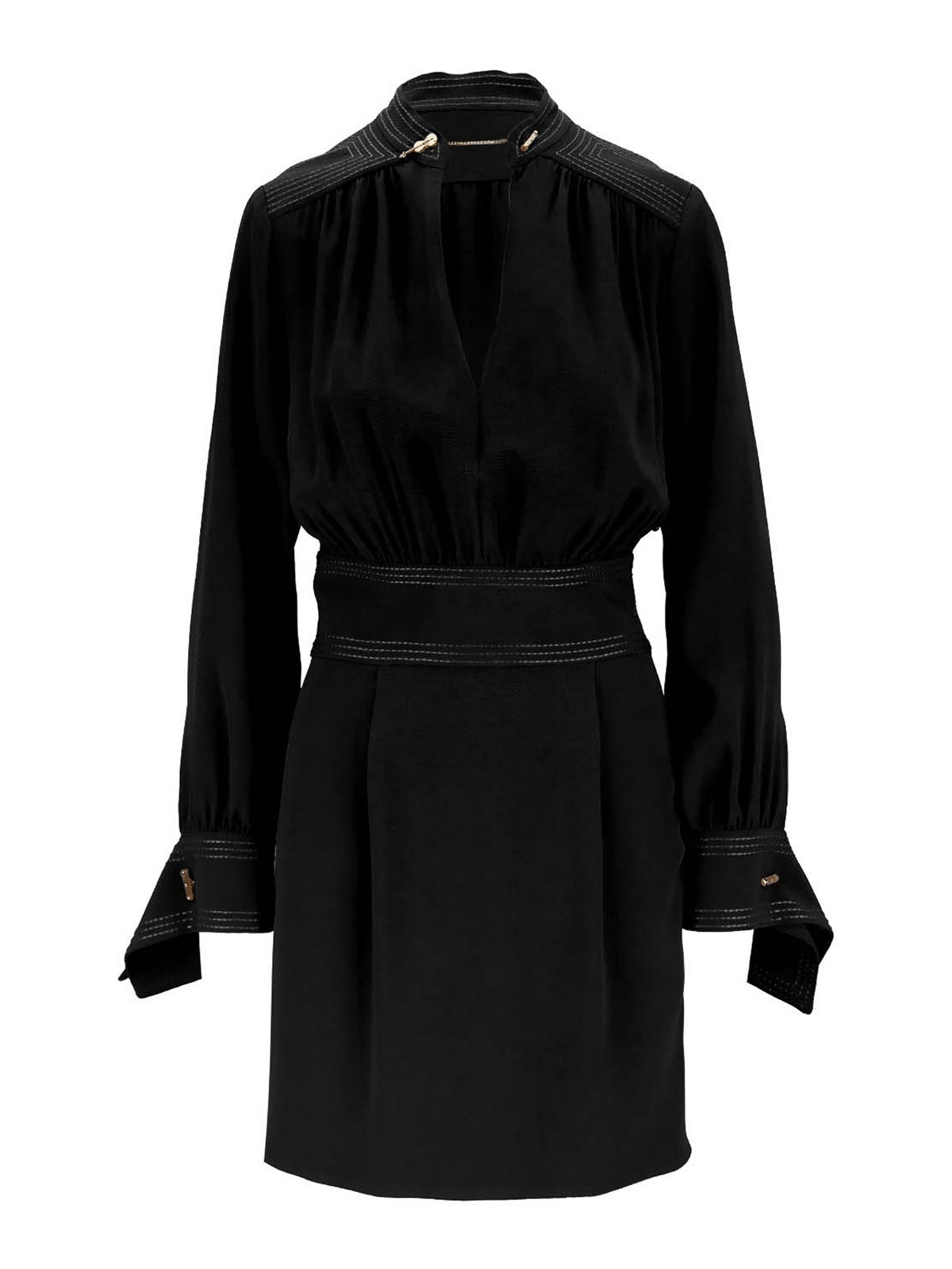 Elisabetta Franchi Damenkleid. tessuto realizzato 71% in acetato e 29% in viscosa. abito corto con scollatura profonda sul davanti a maniche longhe. colletto e maniche presentano chiusure caratterizzate da dettagli in metallo color oro. chiusura capo tramite cerniera, bottoni e gancetto laterali. Hergestellt in Italien