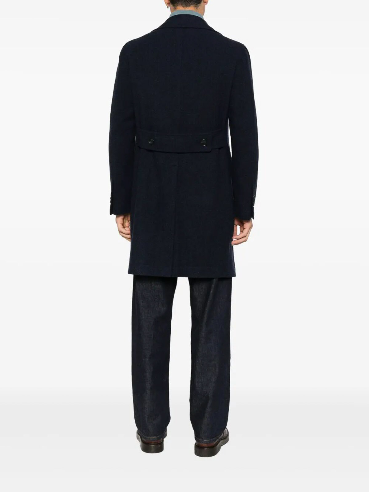 Herrenmantel Bruce in verlängerter Länge aus strukturiertem Stoff. Die blaue Farbe verleiht eine elegante und zeitgemäße Ästhetik.