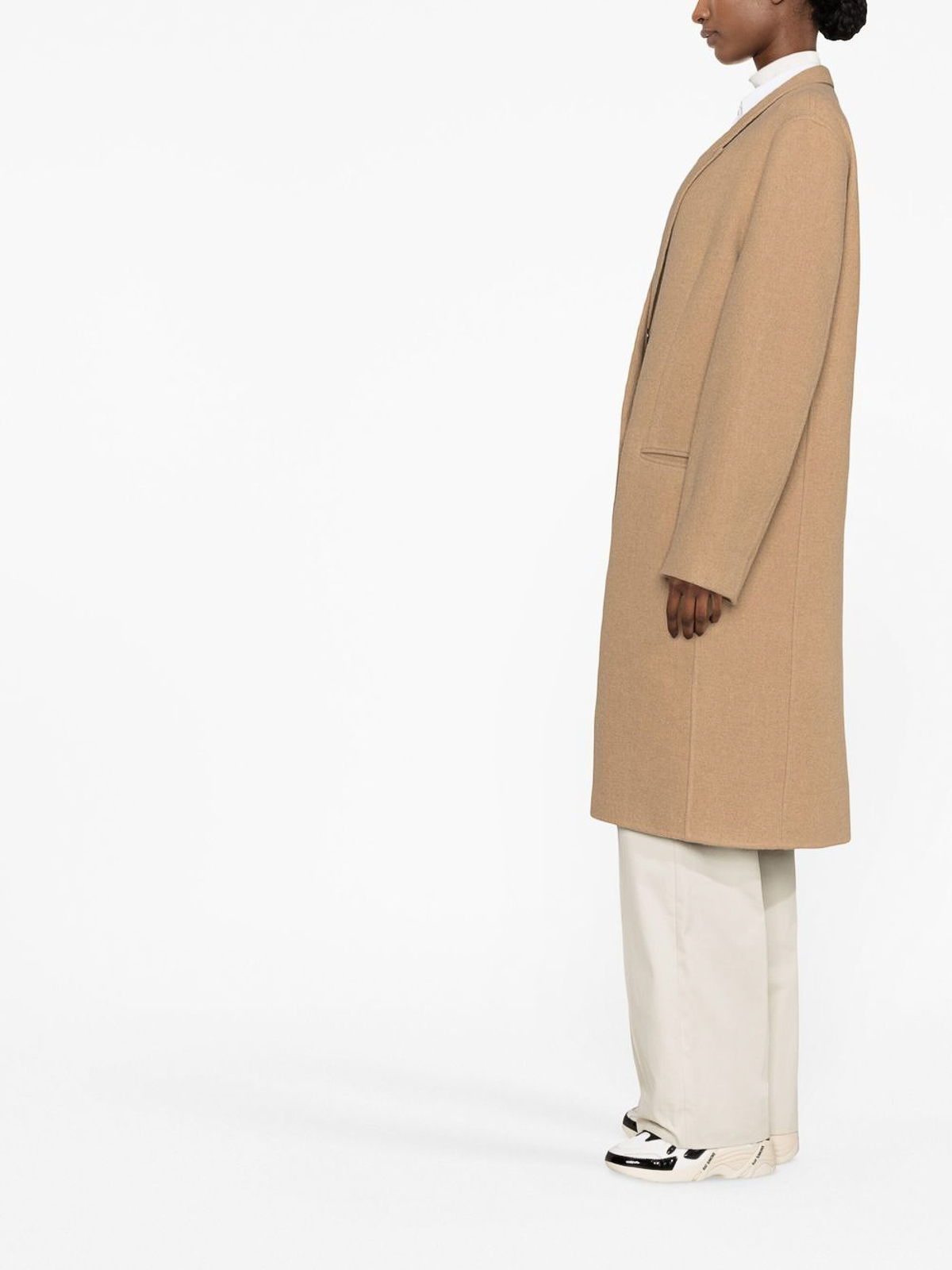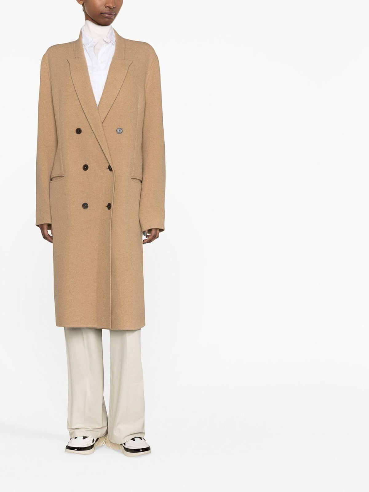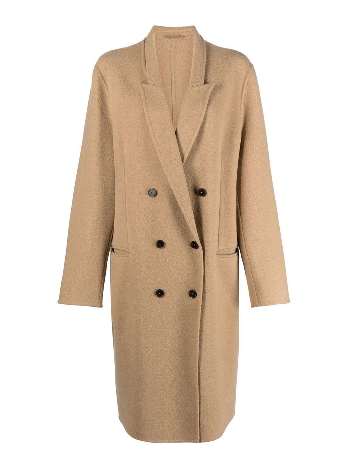 Zweireihiger Midimantel von Closed mit folgenden Eigenschaften: Kamelbraun, spitzes Revers, zweireihiger Knopfverschluss, Abnäher, zwei Jet-Taschen vorne, lange Ärmel und gerader Saum.