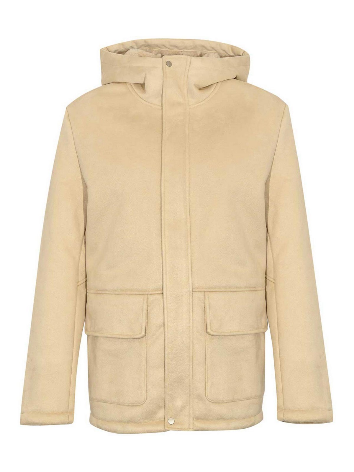 Veloursleder, Effekt Kapuzenjacke Daniele Alessandrini, Effekt mit Muster einfarbig cremefarben lang mit geradem Saum Kragen integrierte Kapuze Reißverschluss mit Druckknopf Pattentaschen zwei aufgesetzte Taschen mit Klappe, Effekt außen weich innen Ton, Ton, Strukturnähte veredelte Manschetten und Saum gefüttert ja (Lammfell innen) Passform regulär