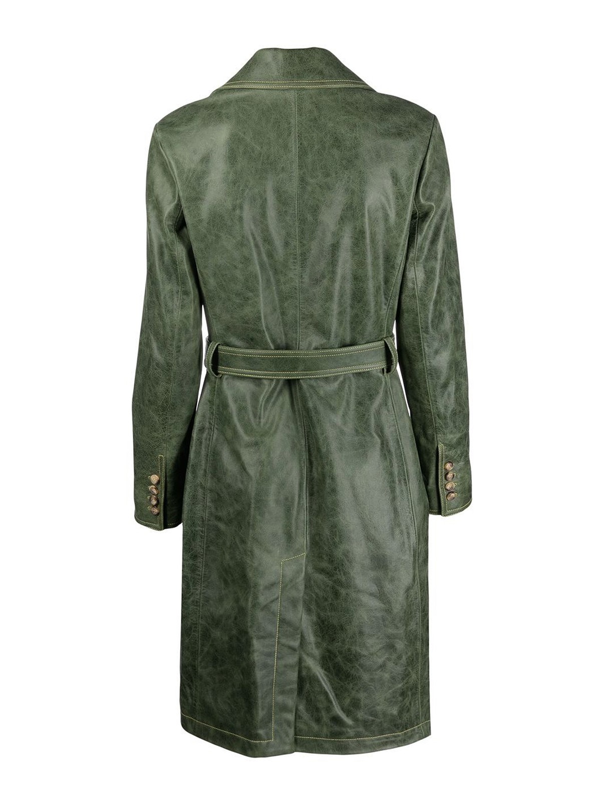 Salbeigrün, Kalbsleder, Taillenbund mit Gürtel, zweireihiger Knopfverschluss, lange Ärmel, zwei seitliche Pattentaschen.