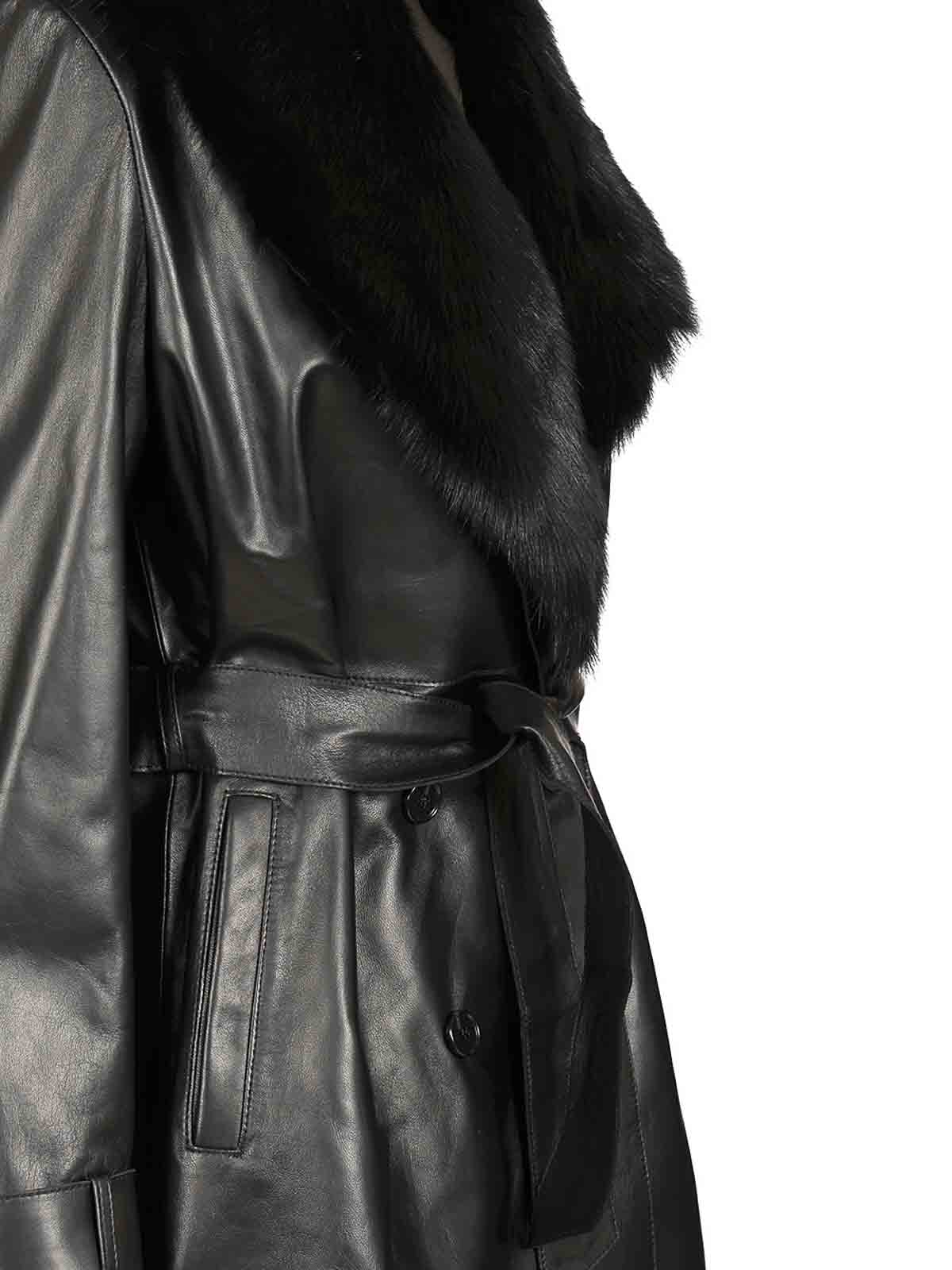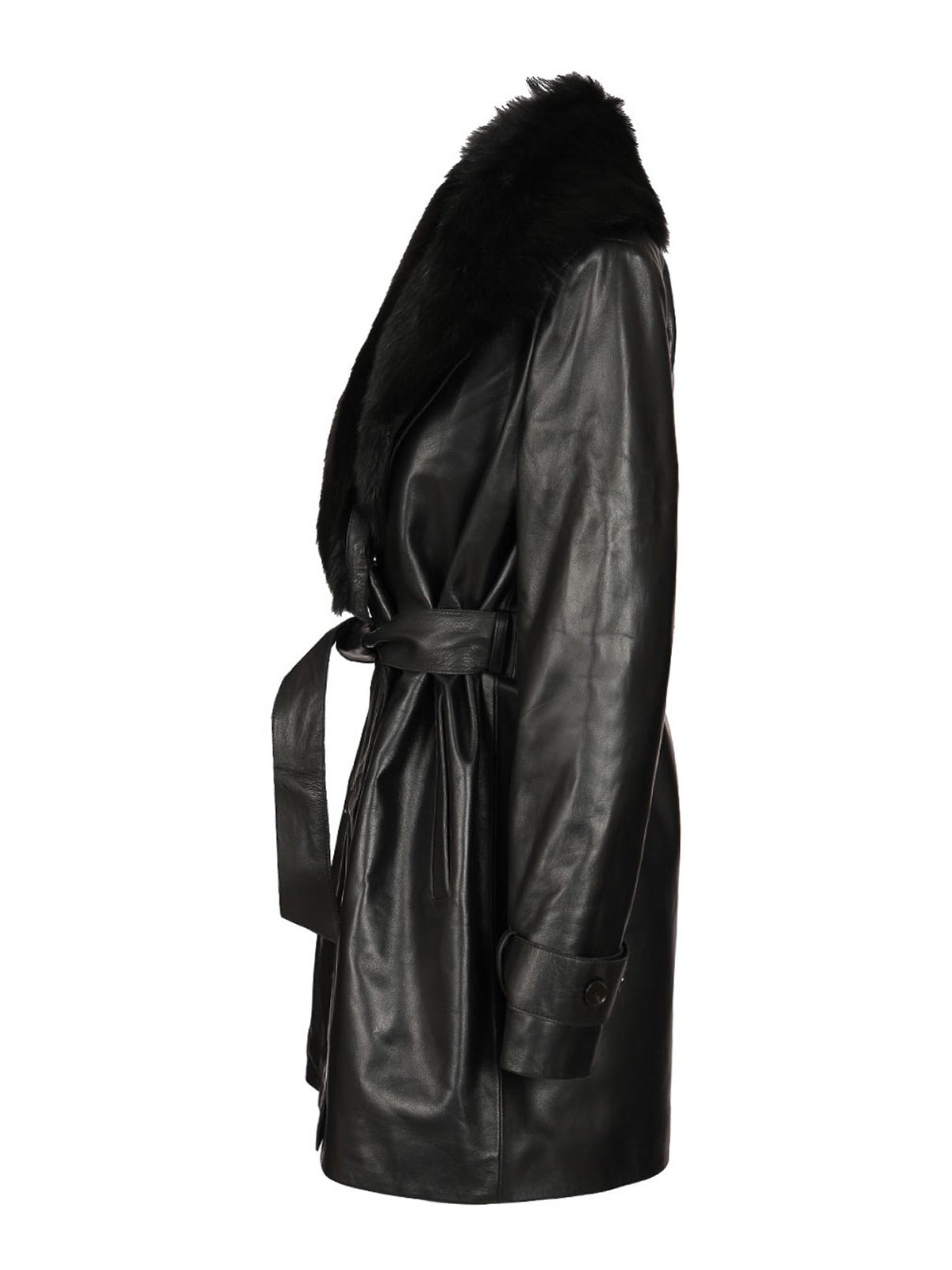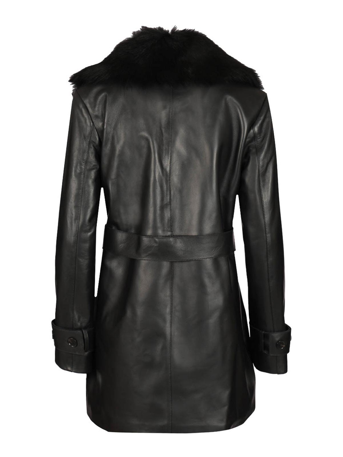 Zweireihiger Ledermantel mit Gürtel und Leistentaschen