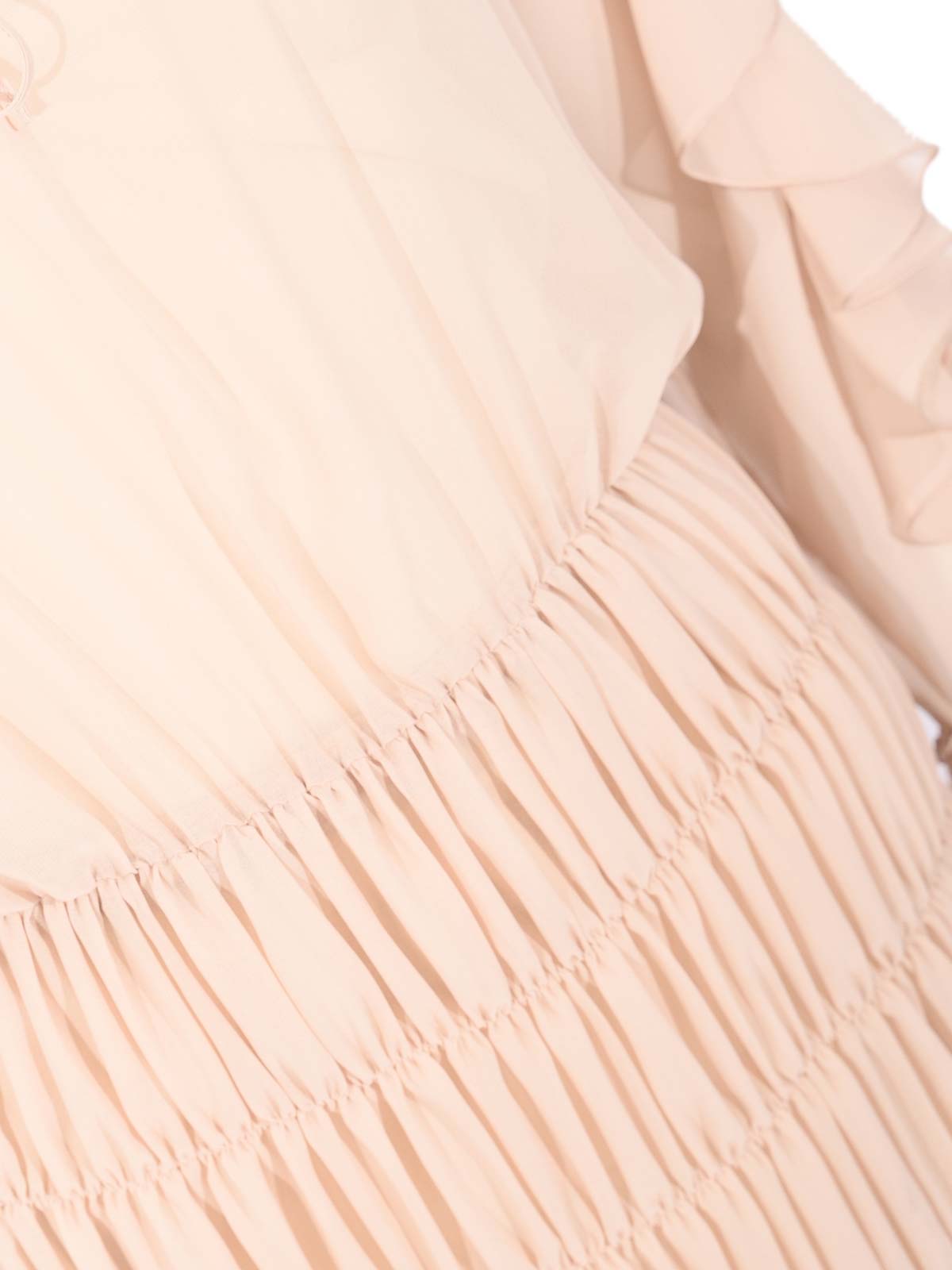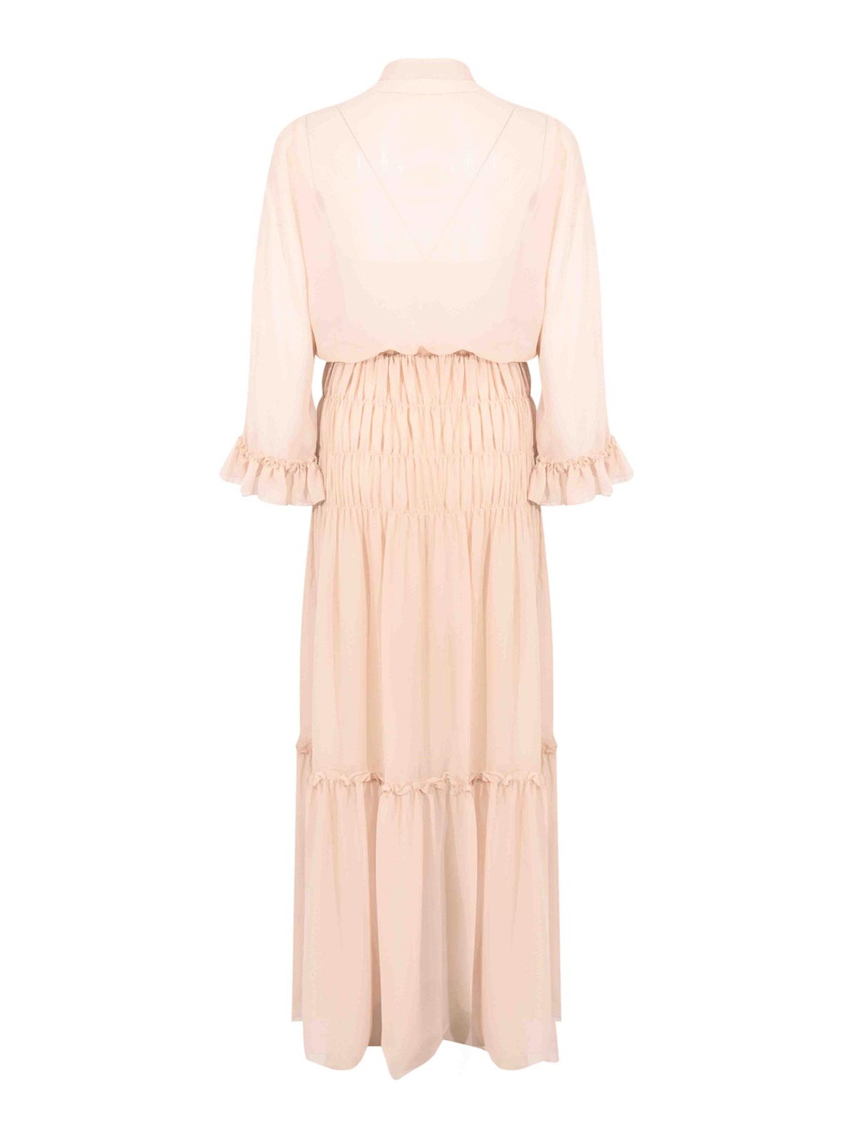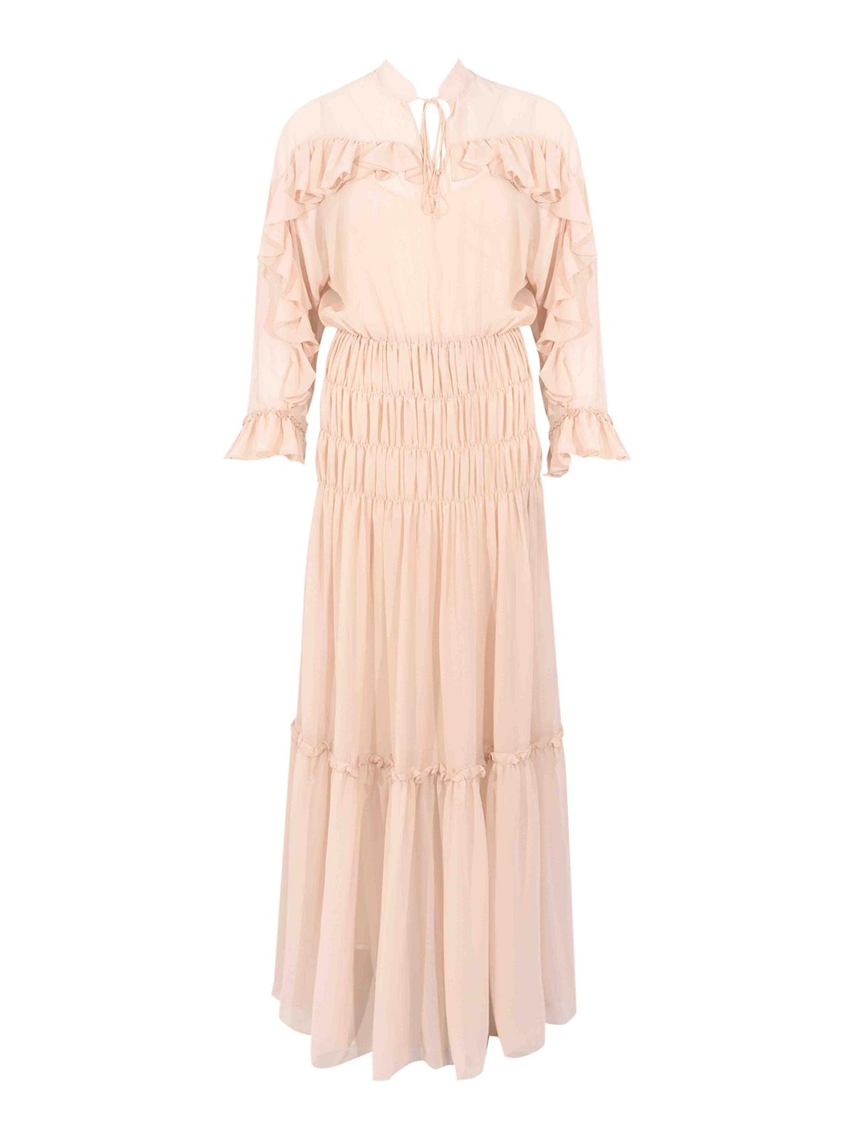 Langes Damenkleid in Georgette, d.exterior, Modell mit Rüschen, Stoff: Georgette, Muster: einfarbig, Ärmel: lang mit gerafften Manschetten, Kragen: koreanisch mit Kordelzug, Verschluss: Frontöffnung mit Kordelzug, Taschen: nicht vorhanden, Details: Rüschen an Schultern und Ärmeln, elastischer Bund mit gerafftem Detail, fließendes Volantrock, Futter: S, Passform: weich