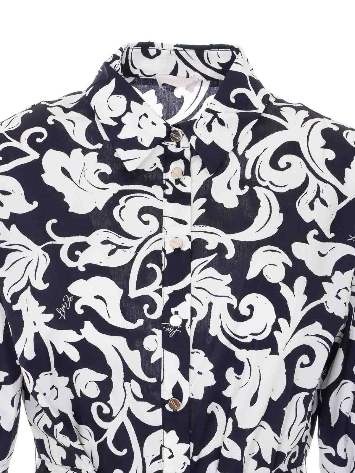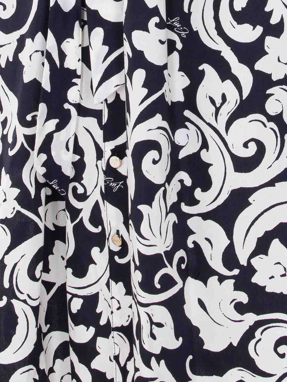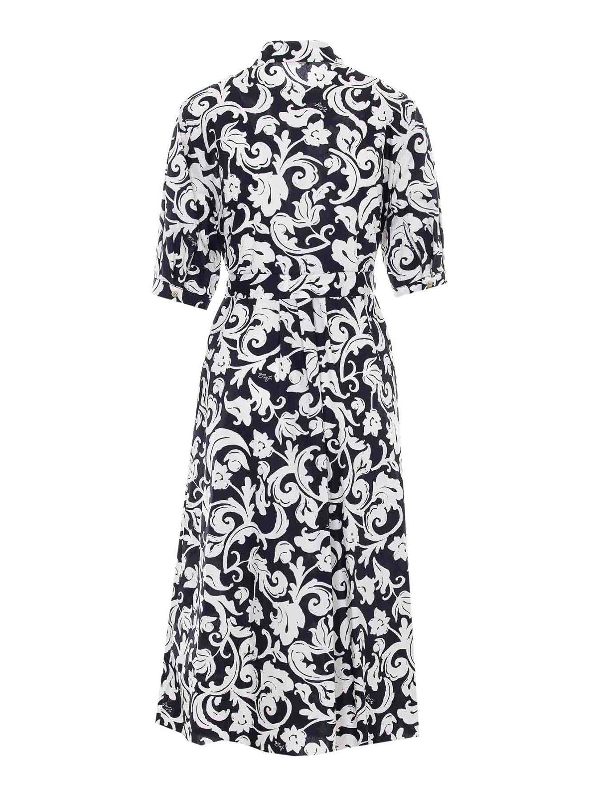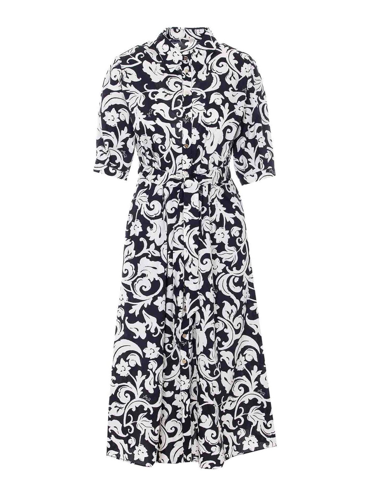Liu Jo langes Kleid in Blau und Weiß, Druckknopfverschluss, durchgehendes Logo, Blumenmuster, Gürtel