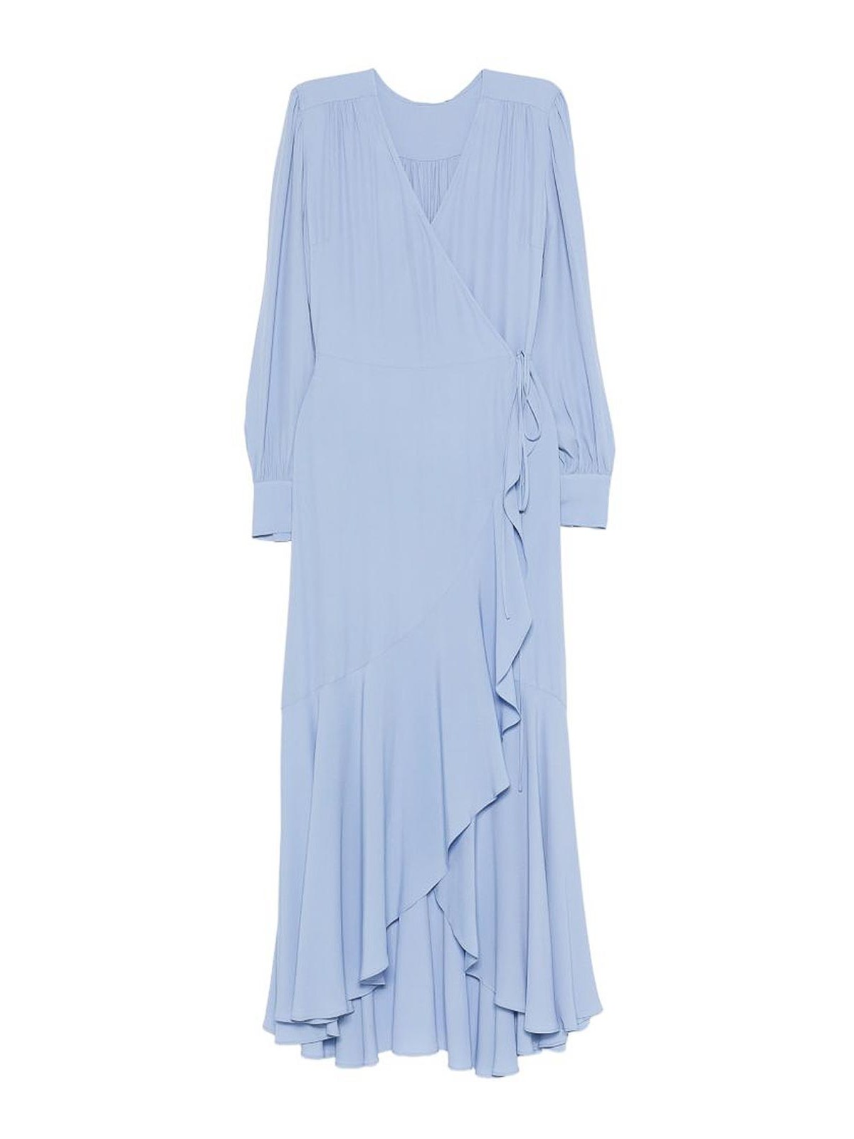Langes Wickelkleid von Twinset aus blauem Stoff mit Rüschenbesatz, langen Ärmeln, Bindeverschluss und V-Ausschnitt. Die fließende Silhouette betont die Figur und sorgt für elegante Vorhänge mit Bewegung, die dem Kleid eine romantische und zeitgemäße Eleganz verleihen. Perfekt für besondere Anlässe, Abendveranstaltungen oder raffinierte Tageslooks. Dieses Kleid von Twinset kombiniert Weiblichkeit mit modernem Stil.