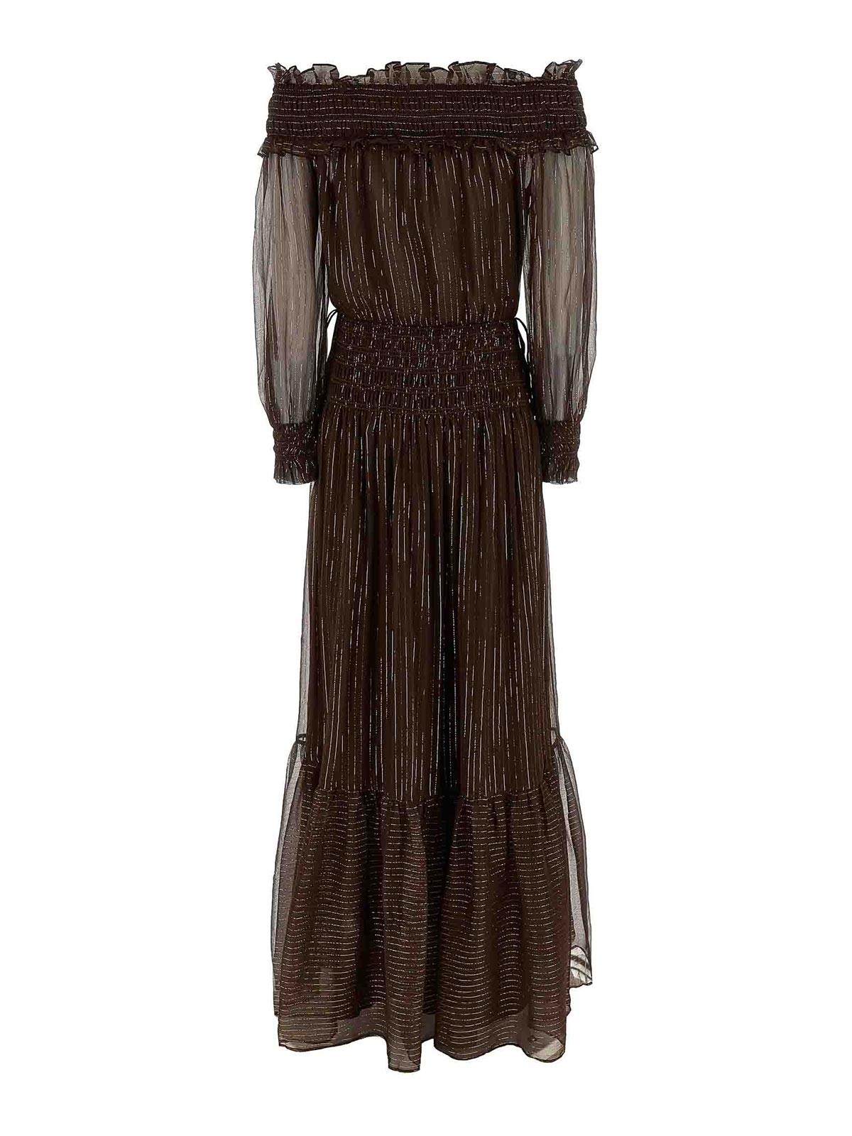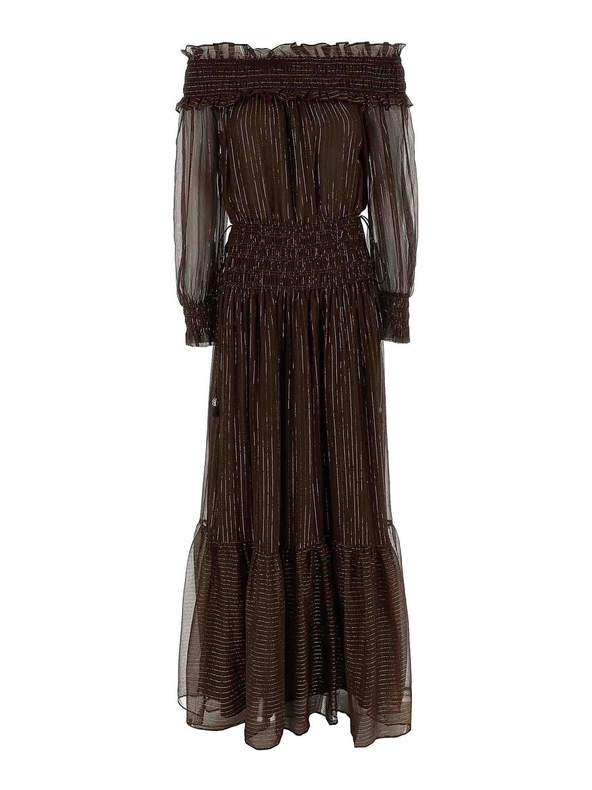 Braunes, schulterfreies Maxikleid aus gekräuselter Georgette mit Lammfäden, schulterfreies Modell mit Rüschen und oberem Kittelstich, an der Taille und an den Ärmelabschlüssen, Volants am Saum, lange Ärmel mit Manschetten, Kordelzug in der Taille.