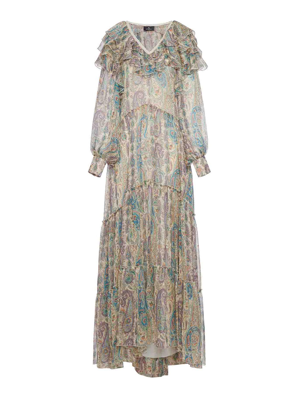 langes Rüschenkleid, Seidenchiffon, breiter V-Ausschnitt mit Spitzenbesatz, durchgehendes florales Paisleymuster, Rüscheneinsatz im Cape-Stil, lange Ärmel, geknöpfte Manschetten, breiter Ausschnitt, der den Rücken freilegt, reguläre Passform, 100% Seide, Farbe: mehrfarbig
