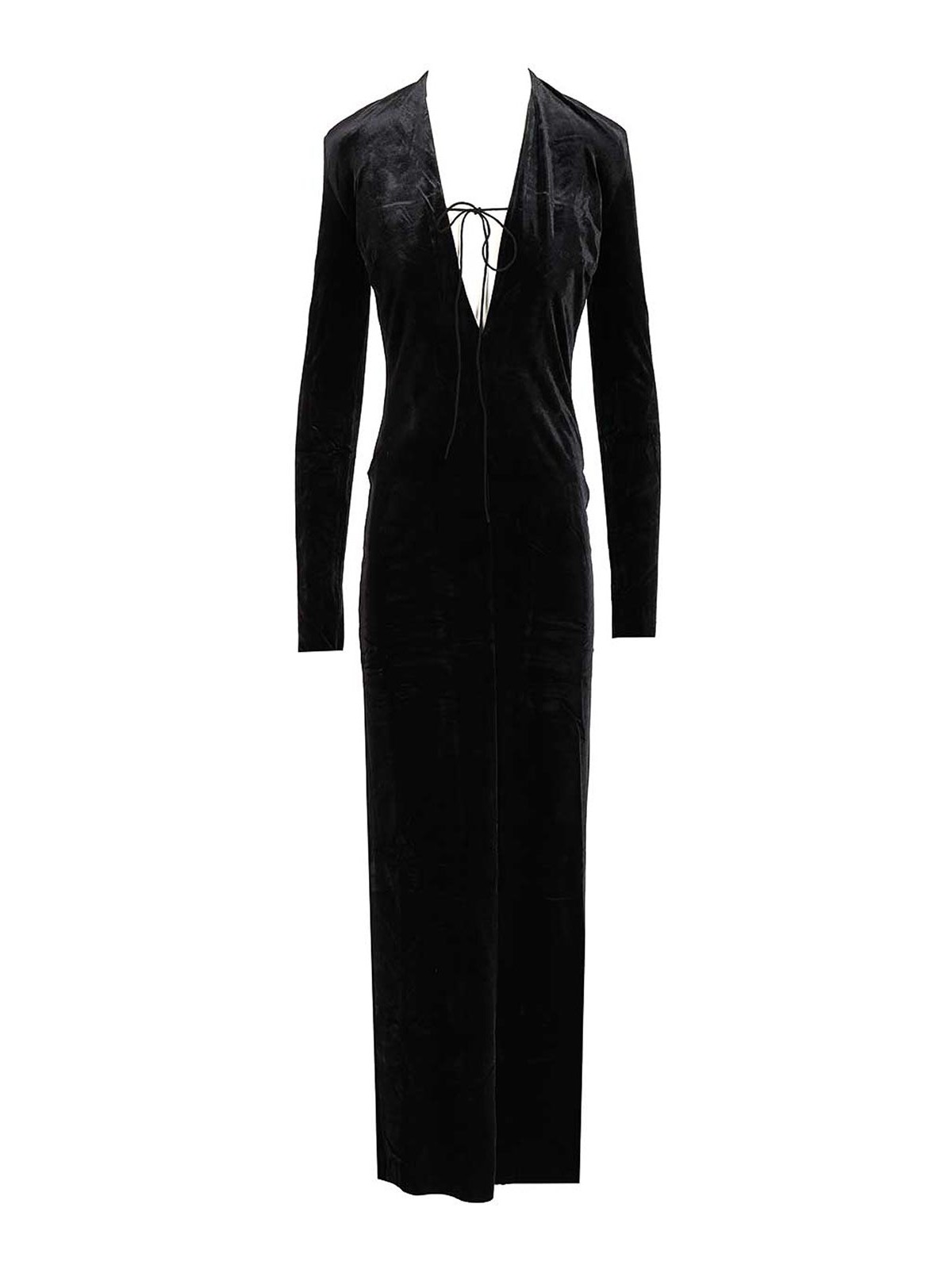 Maxikleid Lara aus Samt aus Stretch von Amazuin mit tiefem V-Ausschnitt, langen, rohen, geschnittenen Ärmeln, strukturierten Schulterriemen und verstellbaren Bändern zum Binden in der Taille, vervollständigt durch einen fließenden Rock und einen offenen, geschnittenen Saum
