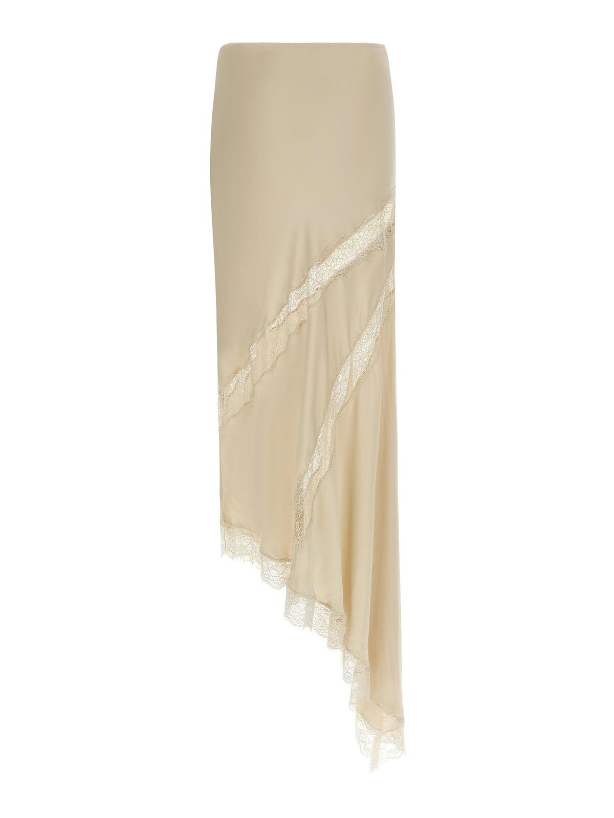 Rosettas langer Rock aus kalt gefärbtem Satin mit farblich abgestimmten Spitzeneinsätzen, mittelgroßem elastischem Bund und asymmetrischem Meerjungfrauensaum.