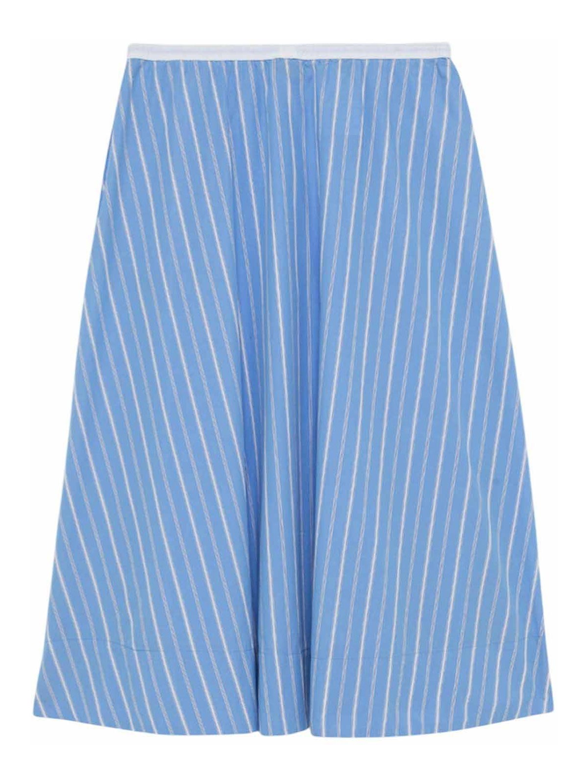 Roy Roger's, Caprirock aus gestreifter Popeline, hellblau, Caprirock aus gewaschener Baumwollpopeline mit Streifenmuster, gekennzeichnet durch eine frische und leichte Linie, ideal für die Sommersaison. das Design kombiniert Schlichtheit und Funktionalität und bietet ein vielseitiges Kleidungsstück perfekt für lässige und alltägliche Looks. Das Modell verfügt über eine hohe Taille mit eingefügtem elastischem und verstellbarem Kordelzug, der Komfort und Anpassungsfähigkeit an die Silhouette. die seitlichen Leistentaschen sorgen für Praktikabilität, während das Makro Der Saum an der Unterseite definiert den Charakter des Kleidungsstück. der leicht Die ausgestellte Linie verleiht der Passform Bewegung und Leichtigkeit, gewaschene Baumwollpopeline mit Streifenmotiv, hoher Bund mit eingearbeitetem Gummiband und Kordelzug, seitliche Leistentaschen, Makrosaum am Saum, leicht ausgestellter Schnitt, reguläre Passform.