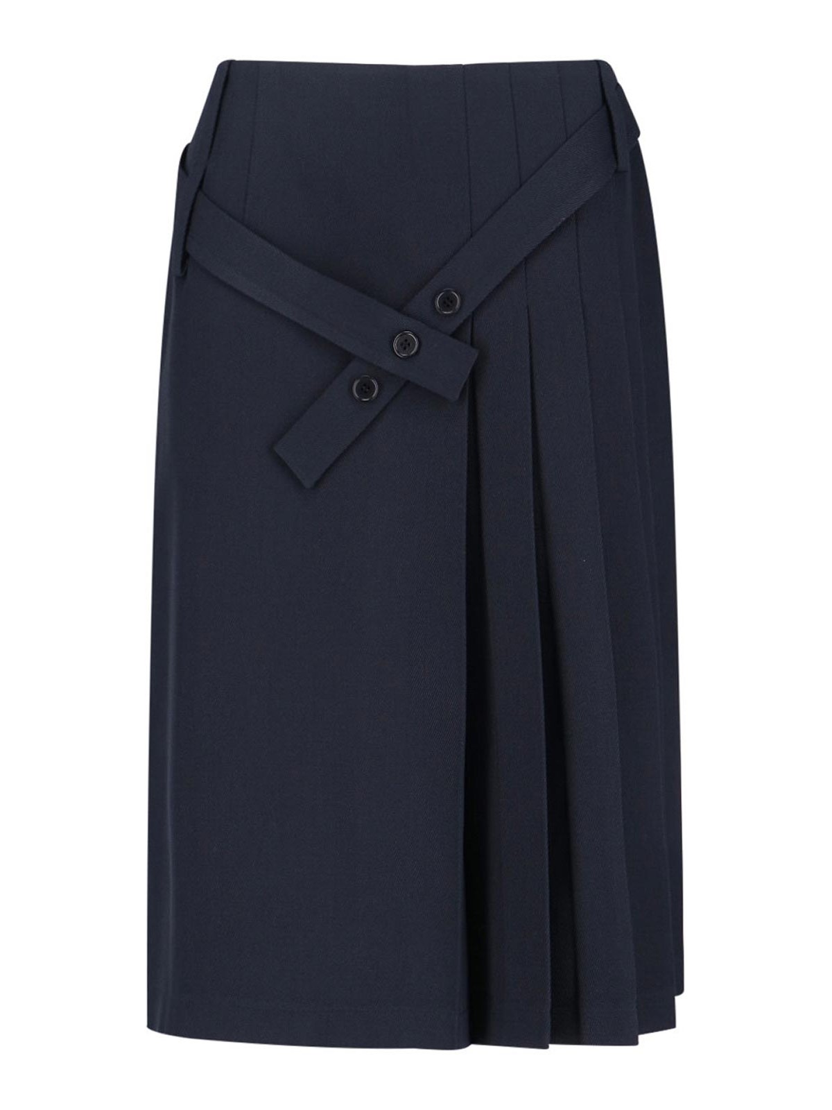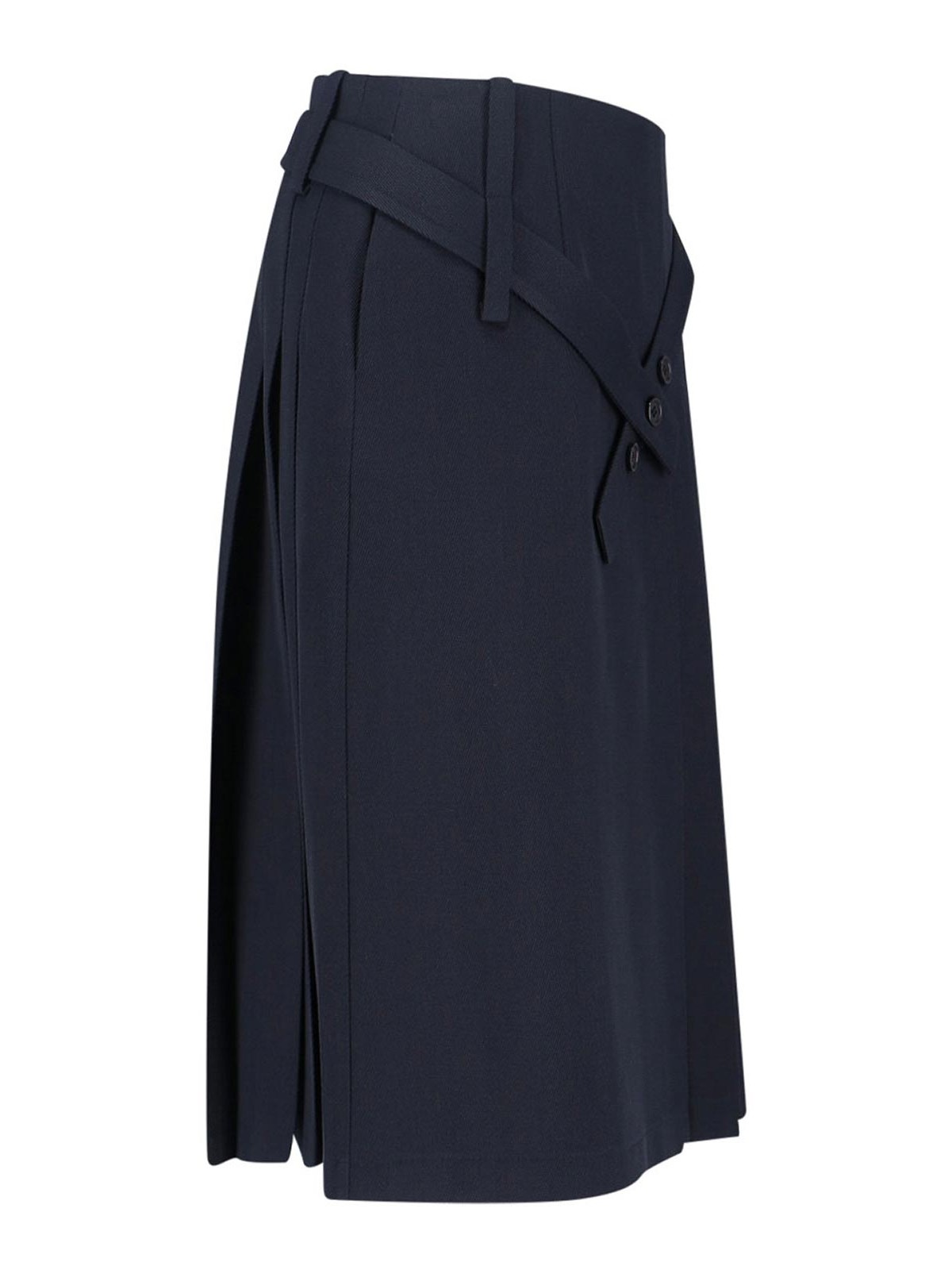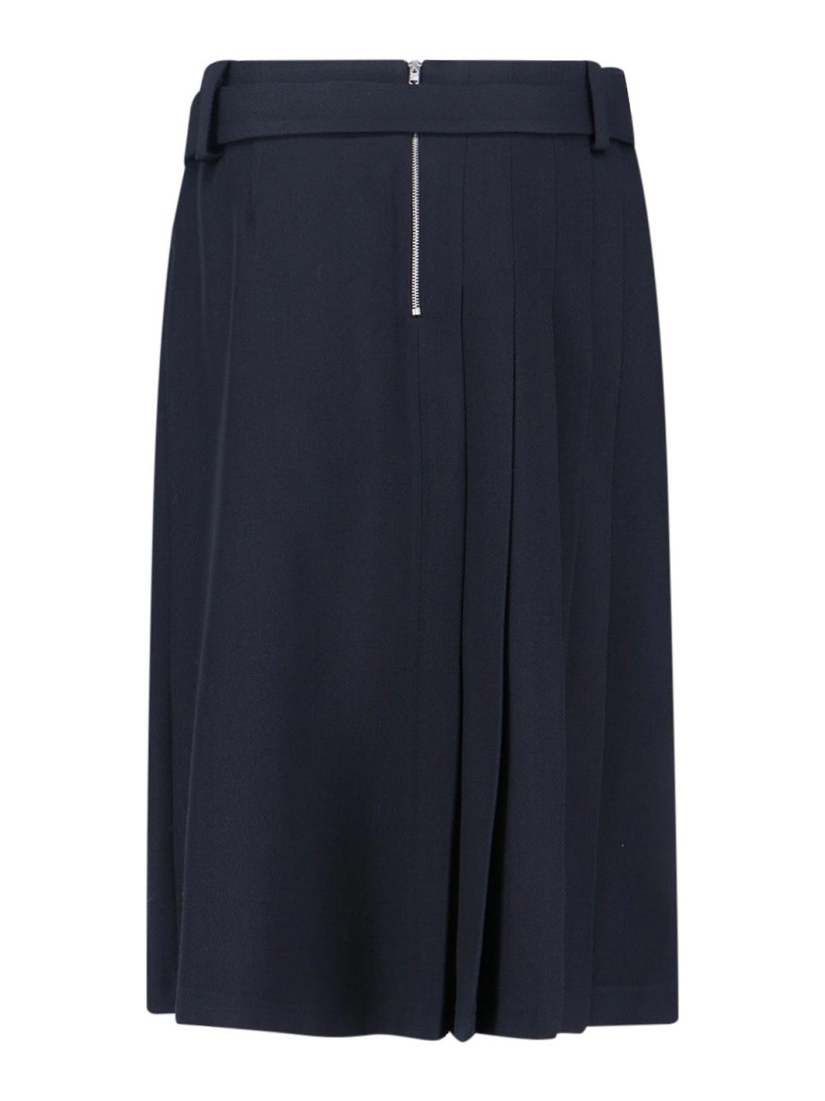 Sibel Saral Midirock aus Schurwolle, Blau, Marineblau, mittlere Taille, Gürtelschlaufen, abnehmbarer und verstellbarer Gürtel, Reißverschluss hinten, plissierte Details an den Seiten, zwei Seitentaschen, gerader Saum.