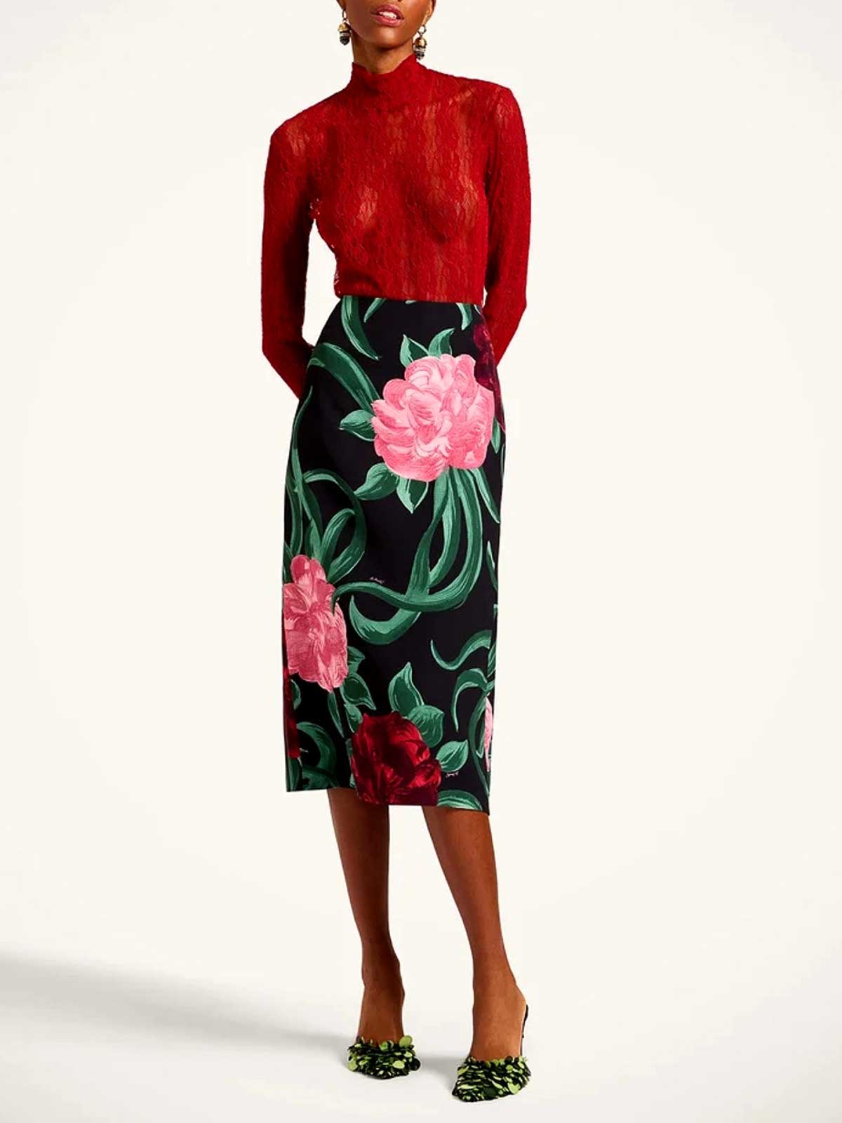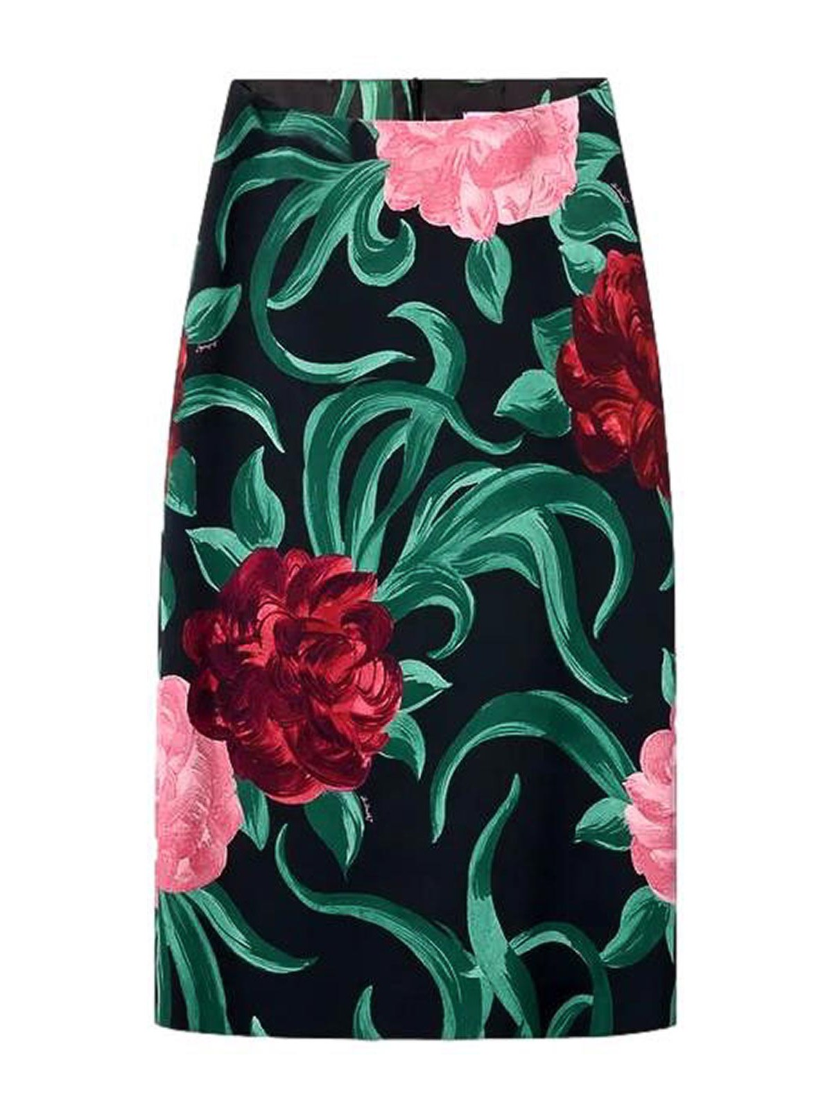 Designer-Farbe: Pfingstrose, Viskose, Blumenmotiv, wadenlang, niedriger Bund, leichte A-Linie, unsichtbarer Reißverschluss.