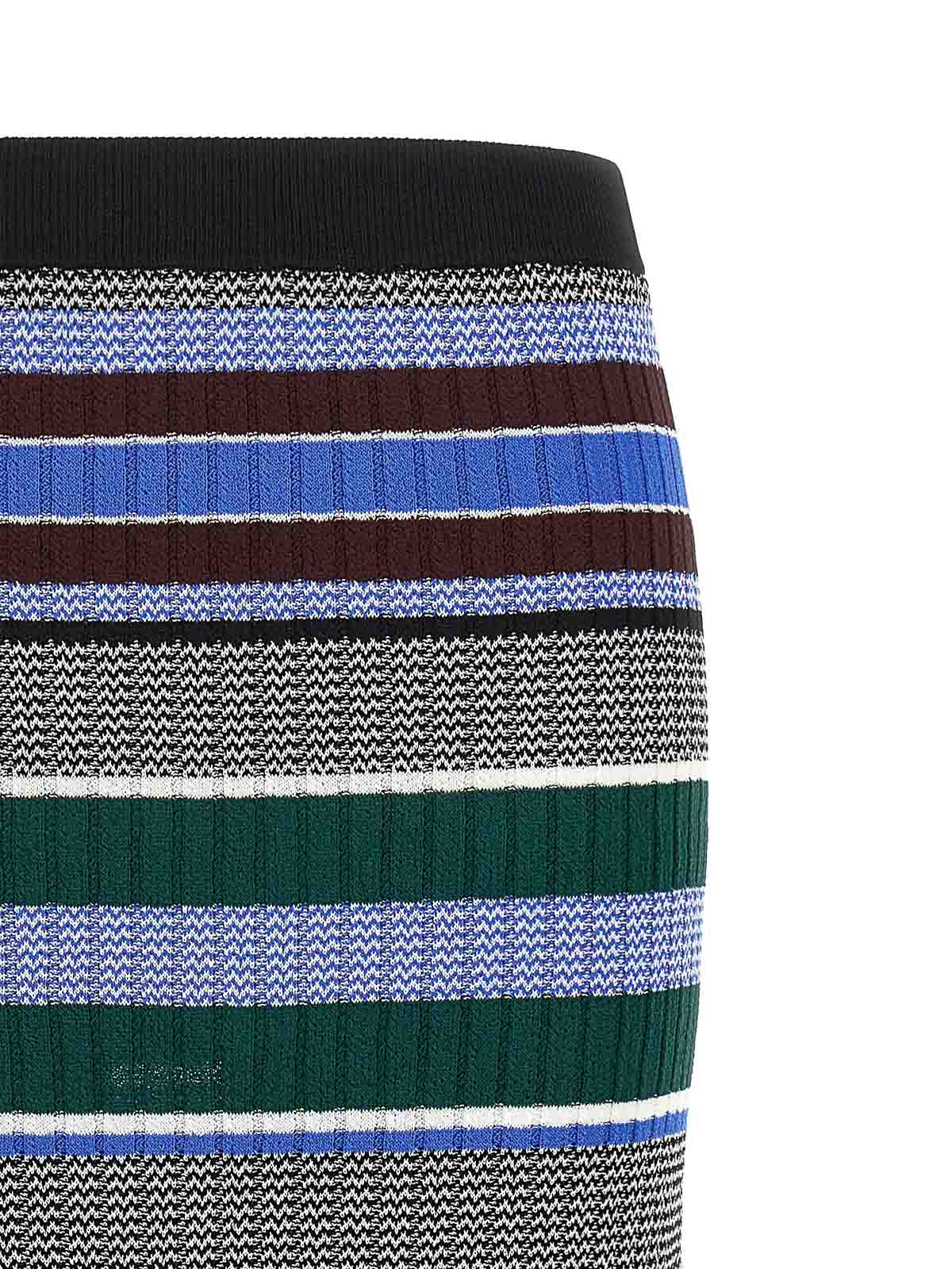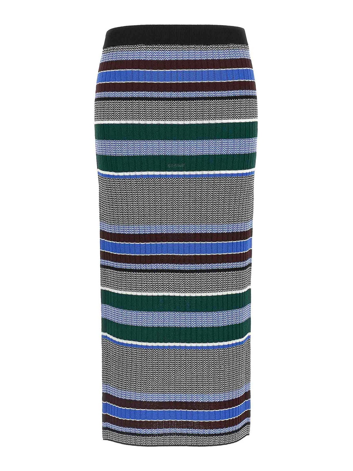 Terra' Midirock aus geripptem Stretch-Viskosestrick mit mehrfarbigen Querstreifen unterschiedlicher Dicke, Longuette-Modell, elastischer Bund.