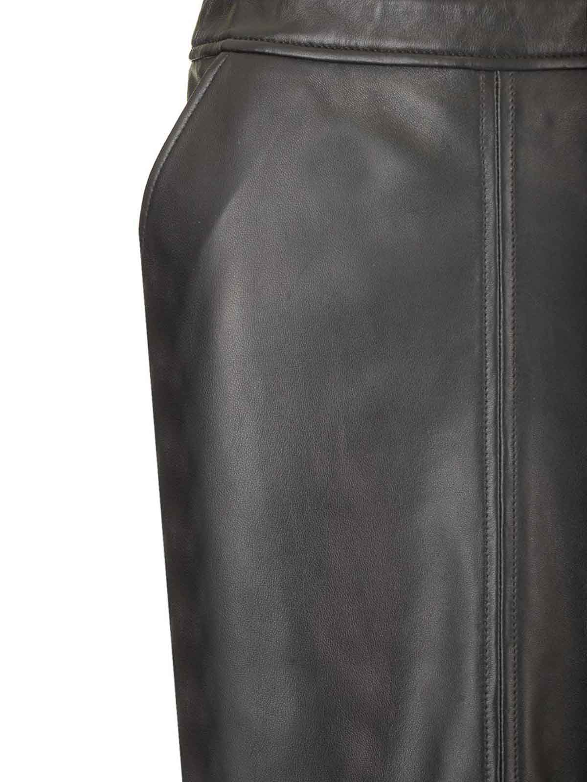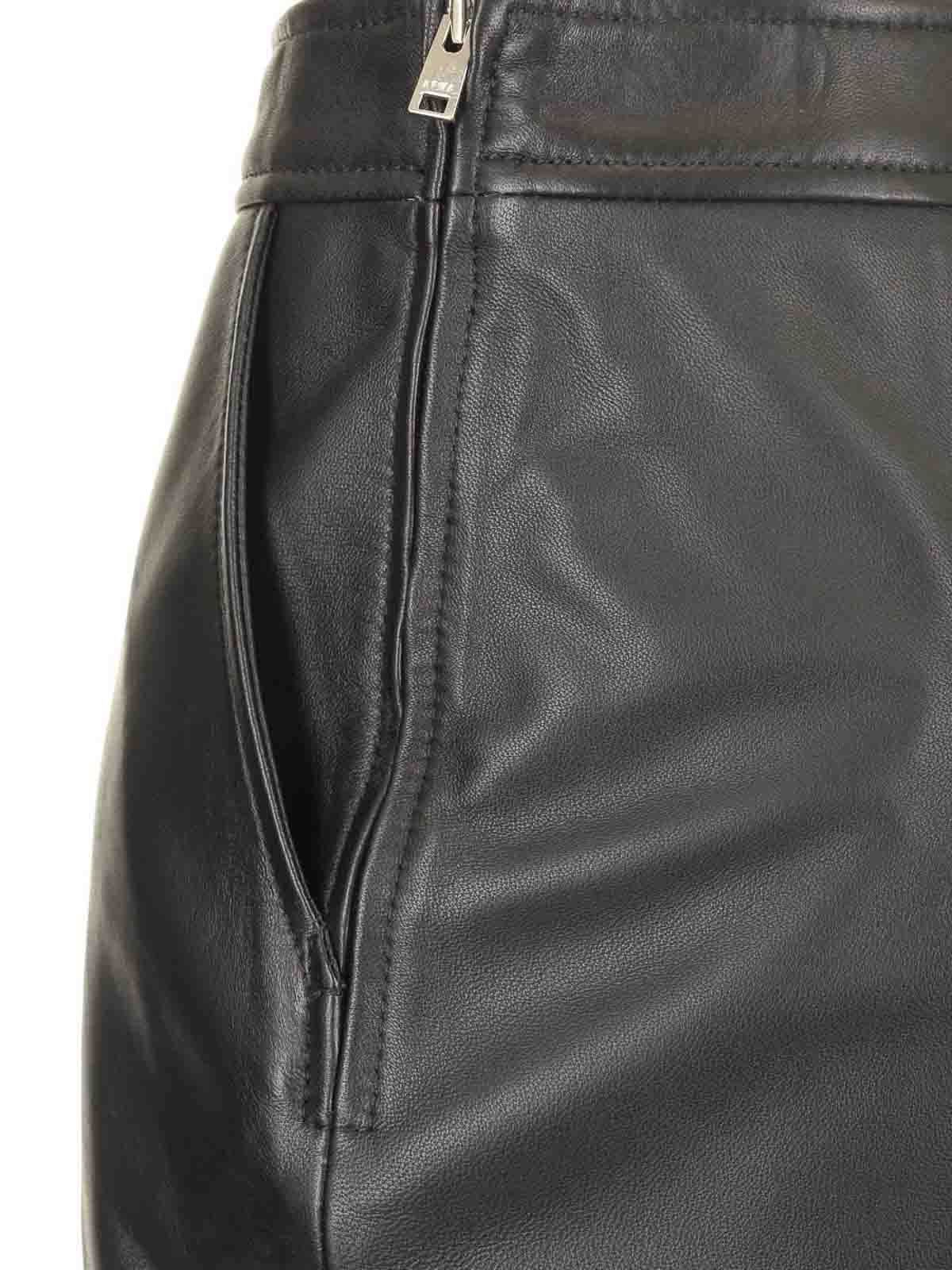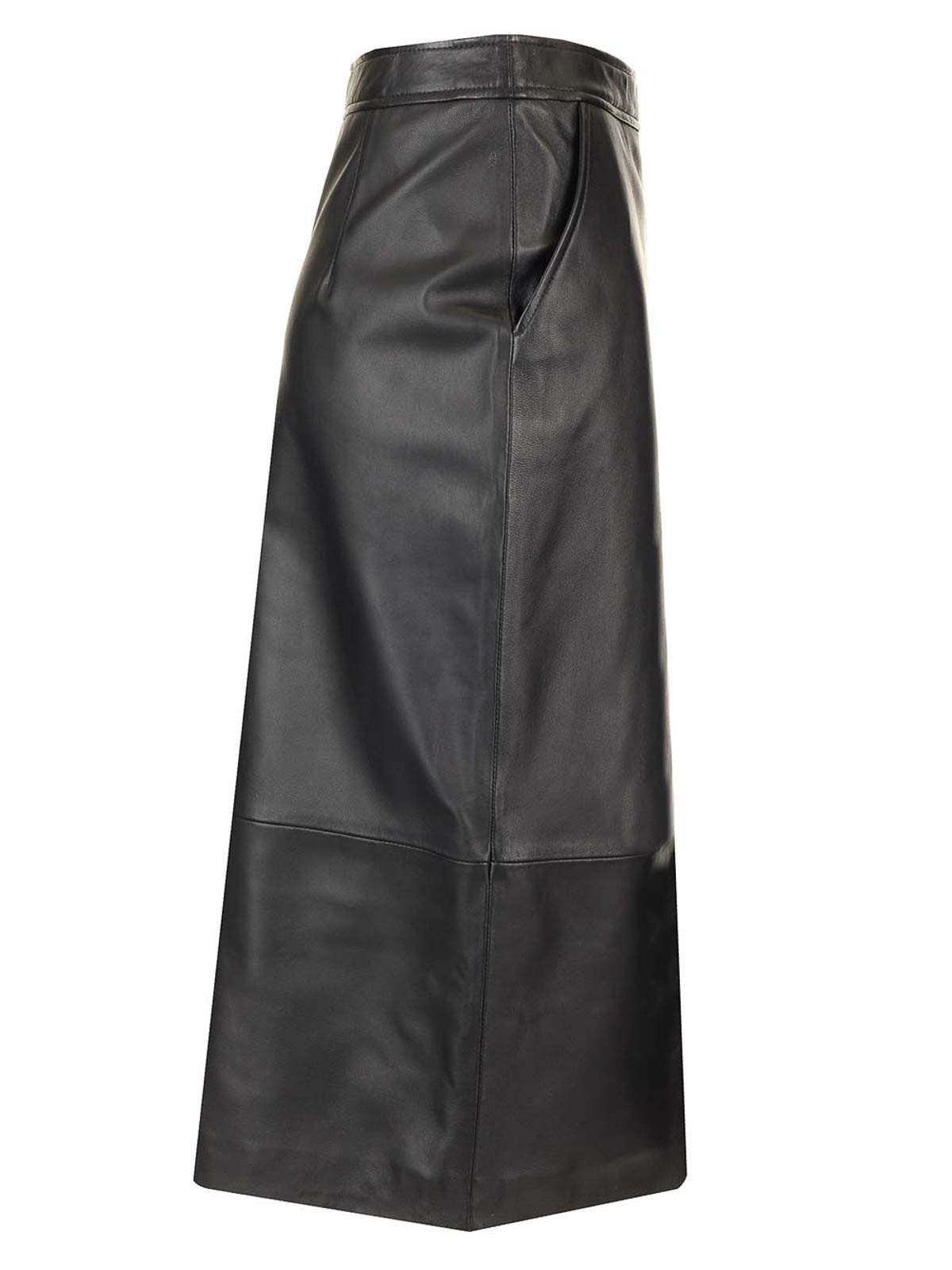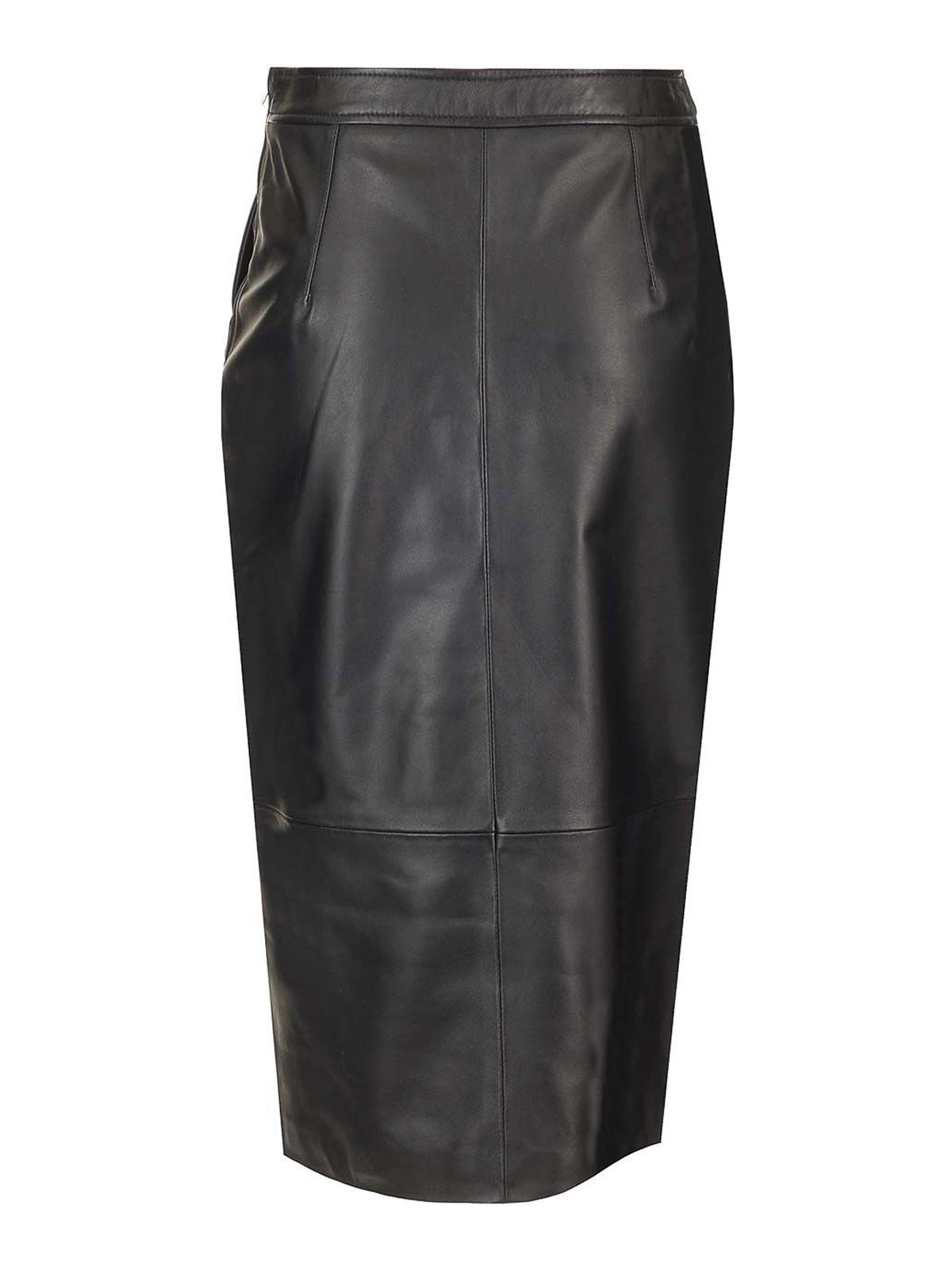 Schwarzer Arkina Bleistiftrock aus Leder von Arma mit zwei seitlichen Leistentaschen und Frontschlitz.