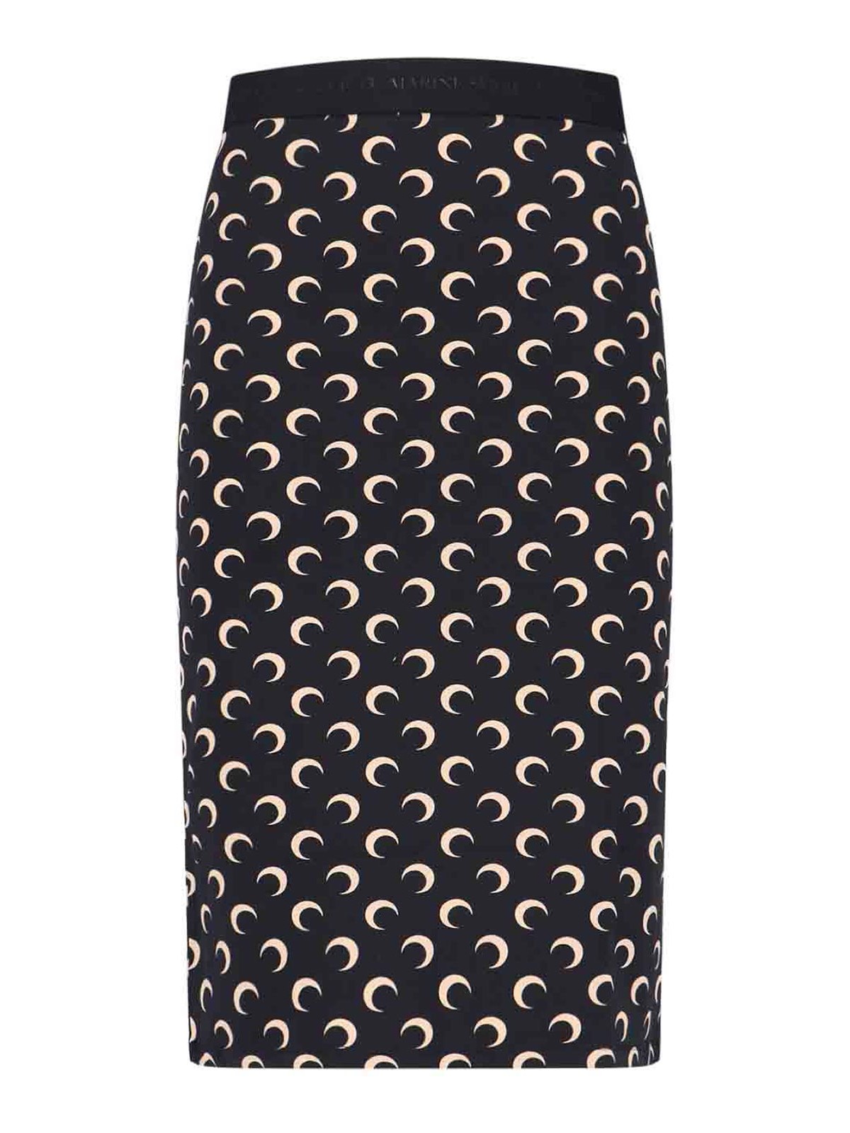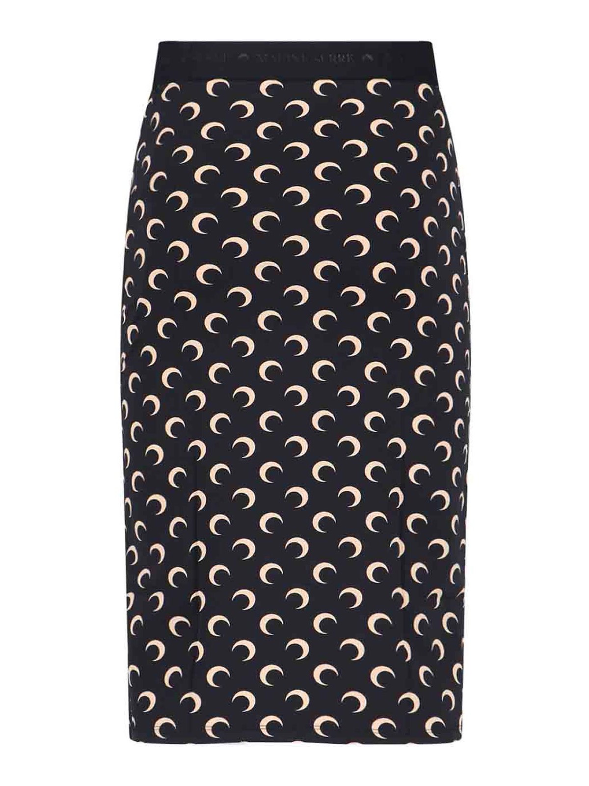 Marinebrauer Midirock in Serre Moon, aus schwarzem Stoff, durchgehendes Moon-Logo-Laserdruckmotiv, mittelgroßer elastischer Bund, geprägtes Logo auf der Taille, gerader Saum.