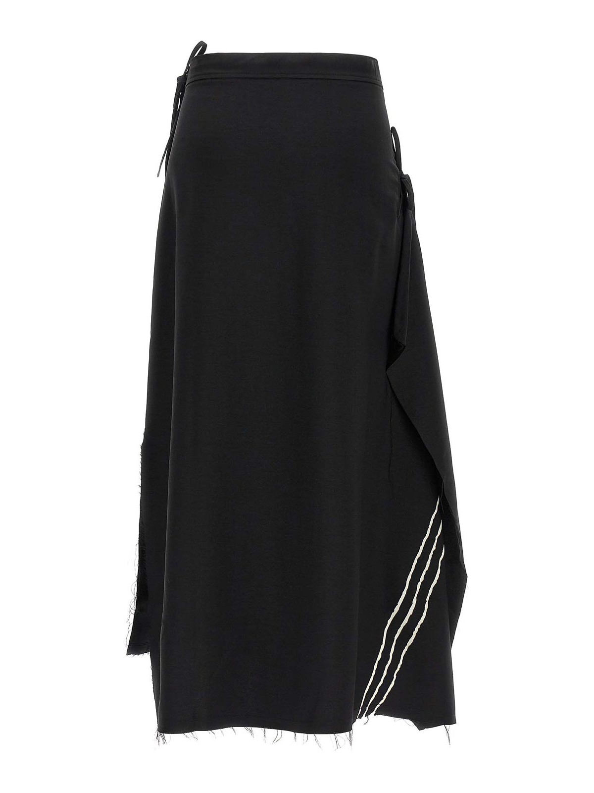 Y-3 Sportuniform Raw Cut Midirock aus 3-Streifen-Twill, kontrastfarbene Logostickerei auf der Vorderseite, teilweise abnehmbares Vorderteil zur individuellen Gestaltung, 3 roh geschnittene Streifen und ausgefranste Kanten, seitlicher Reißverschluss, Schlitze, asymmetrischer Saum.
