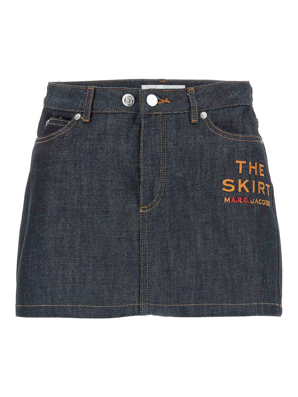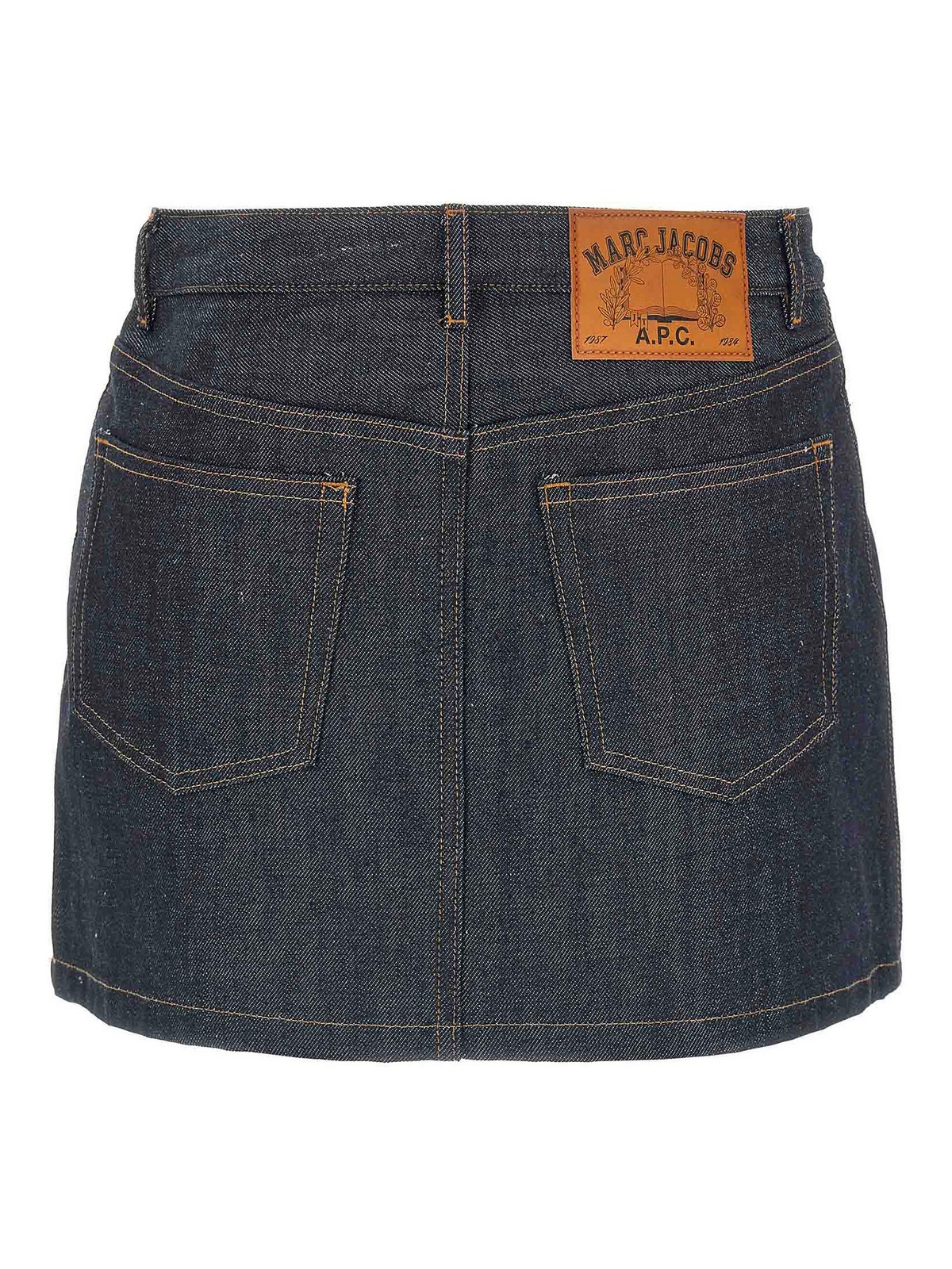 A.P.C. x Marc Jacobs Capsule the Skirt Minirock aus hartem Baumwoll-Denim mit Kontrastnähten, Logostickerei, Reißverschluss und Knopfverschluss auf der Vorderseite, fünf Taschen und ungefüttertem Logo-Etikett aus Leder auf der Rückseite.