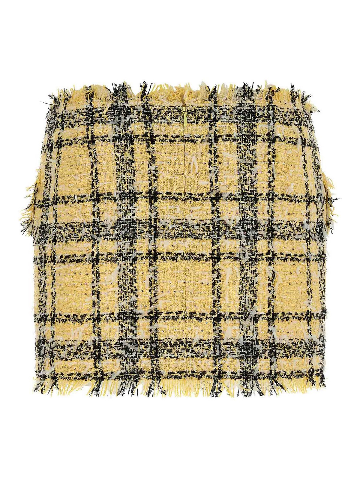 Minirock aus Tweed mit Mikro-Paillettenfäden, Modell mit rückseitigem Reißverschluss, ausgefranstem, goldfarbenem Knopfdetail auf der Vorderseite.