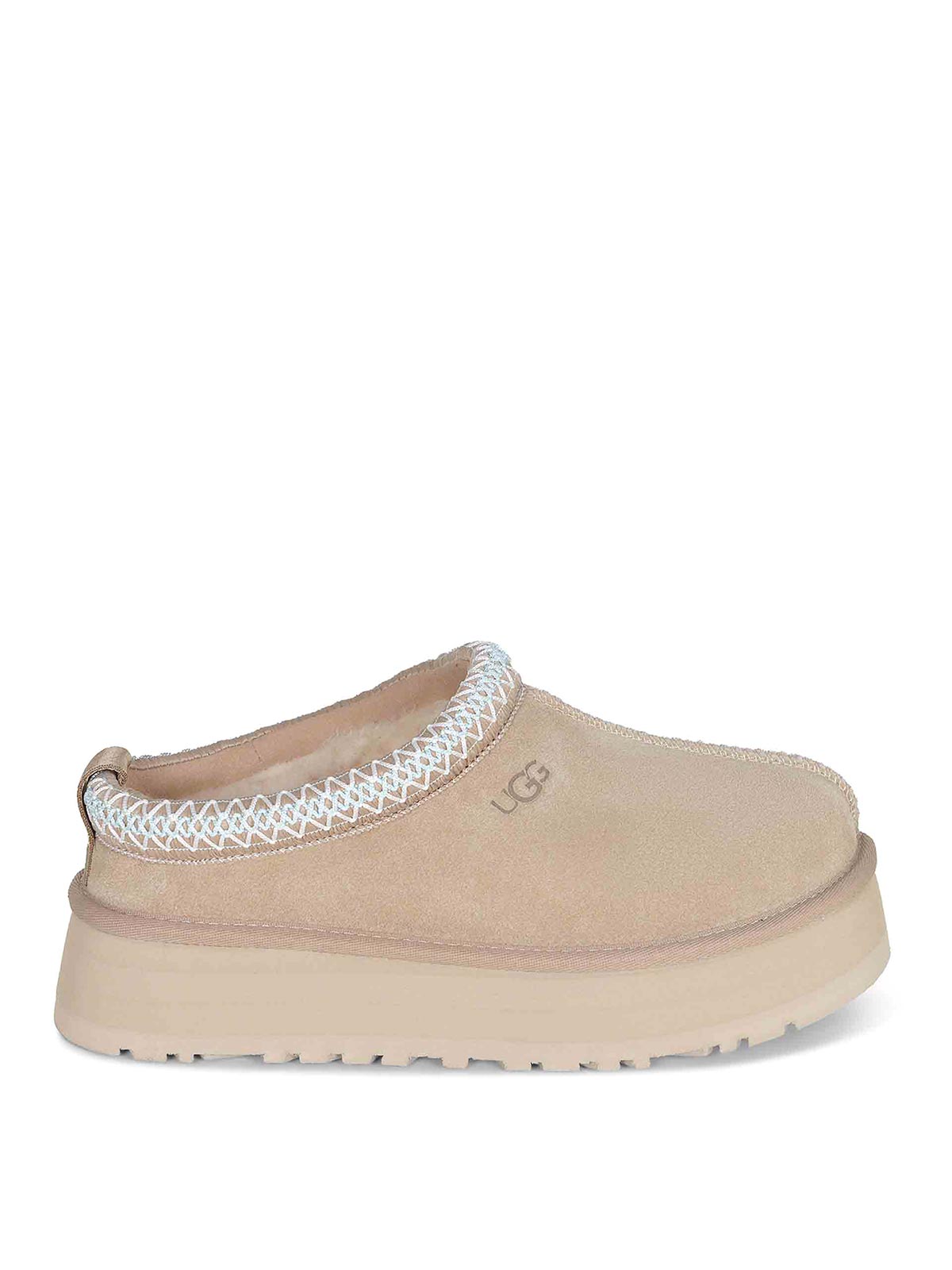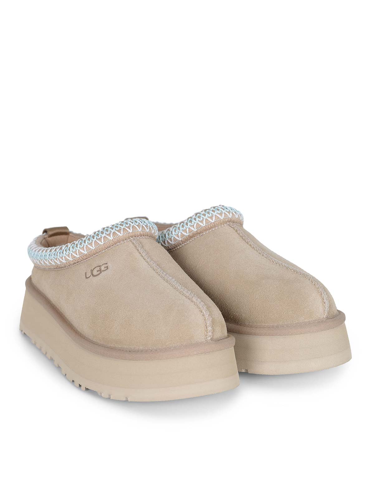 UGG 'Tazz' Pantoffeln aus beigem Veloursleder. Kontrastierende Profile in hellblau/weißer Farbe. geprägter UGG-Logo-Schriftzug. Innenfutter aus Wolle. Hintere Zuglasche. Sohle aus EVA-Gummi. Höhe der Innensohle 4,4 cm. 100% Leder.