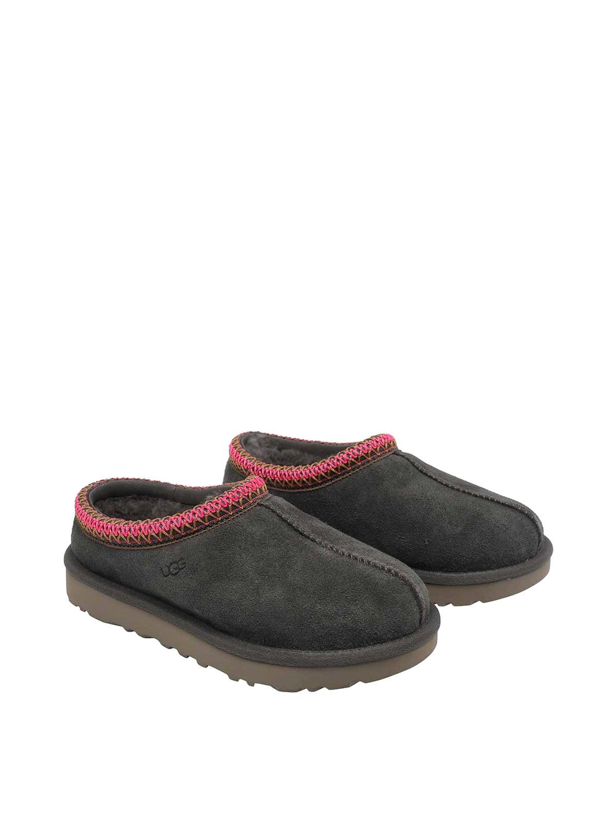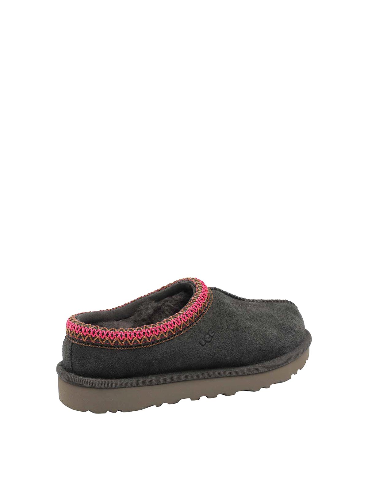 UGG Tasman-Pantolette in Dense Smoke, runde Zehenpartie, Logo, Obermaterial aus Veloursleder