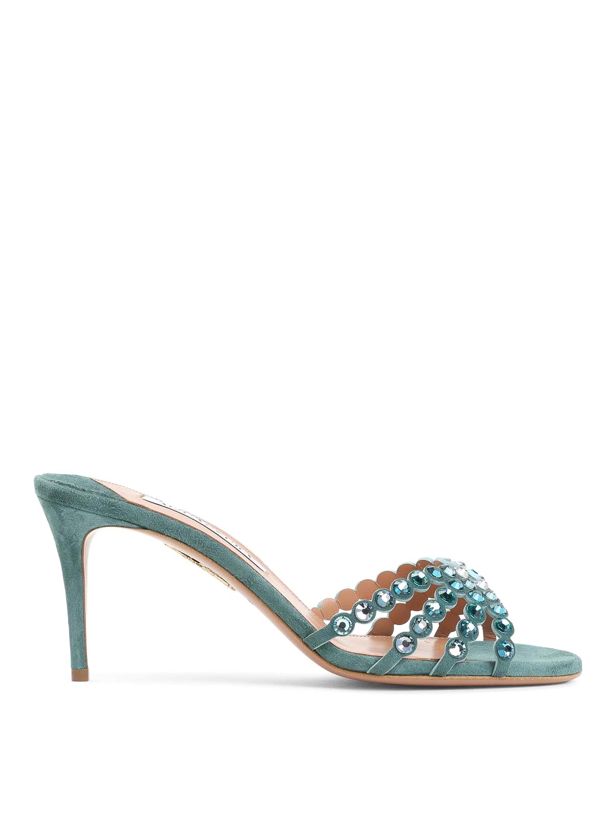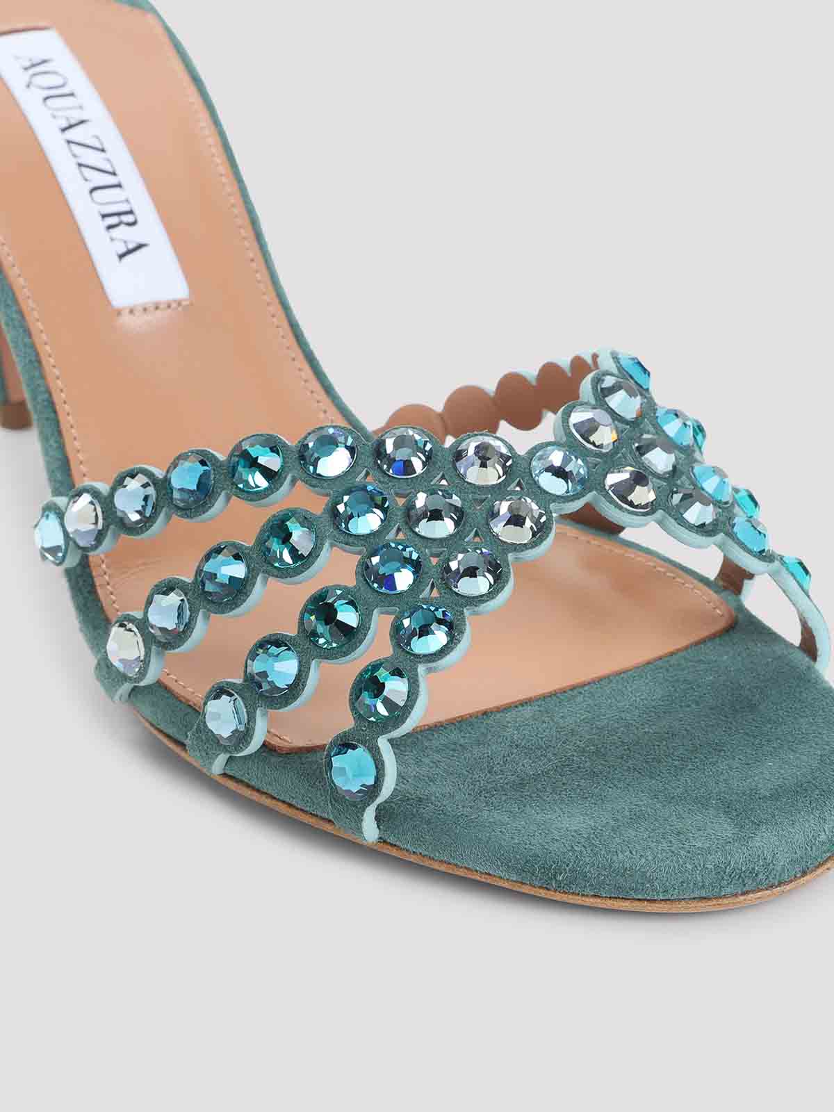 Aquazzura Tequila-Pantolette aus hellblauem Veloursleder für Kinder. Reines hellblaugrünes Veloursleder für Kinder, runde offene Spitze, tonale Riemen mit tonalen Kristalldetails, Slip-On-Stil, dünne High Heels, Ledersohle.