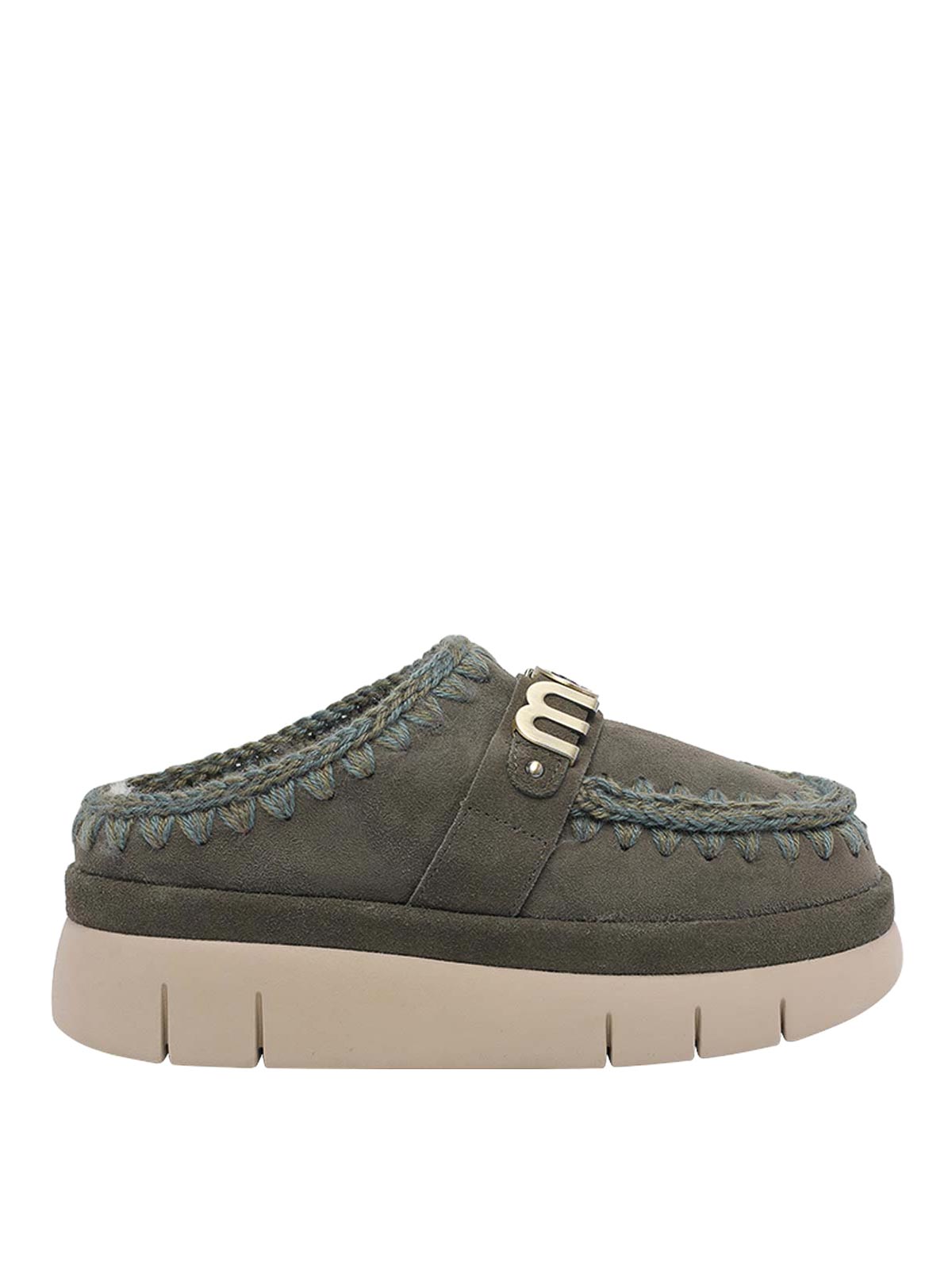 Mou Bounce-Clog aus schwarzem Olivgrün, Logo-Schriftzug auf der Vorderseite, Slip-On, Obermaterial aus Veloursleder