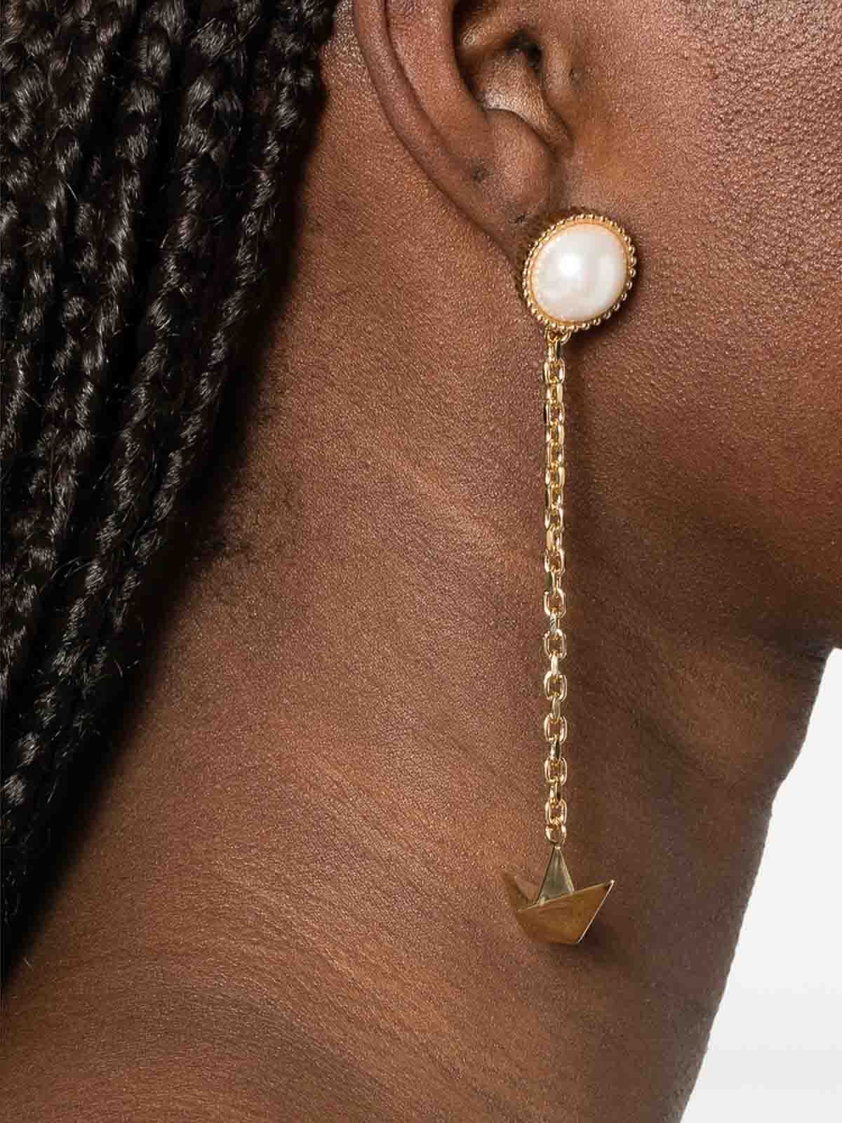 Goldfarbener Anhänger mit Perlenverzierung und Pushback-Verschluss aus Papier. Diese Ohrringe werden als Paar geliefert. Normaler täglicher Gebrauch und äußere Einflüsse können den Glanz von Edelsteinen und Goldoberflächen verringern. Verwenden Sie zur Pflege spezielle, nicht scheuernde Produkte, die speziell für die Reinigung von Schmuck bestimmt sind. Ihr Kauf wird in einer Geschenkverpackung geliefert. Dieses Stück wird komplett mit einem schützenden Staubbeutel geliefert.