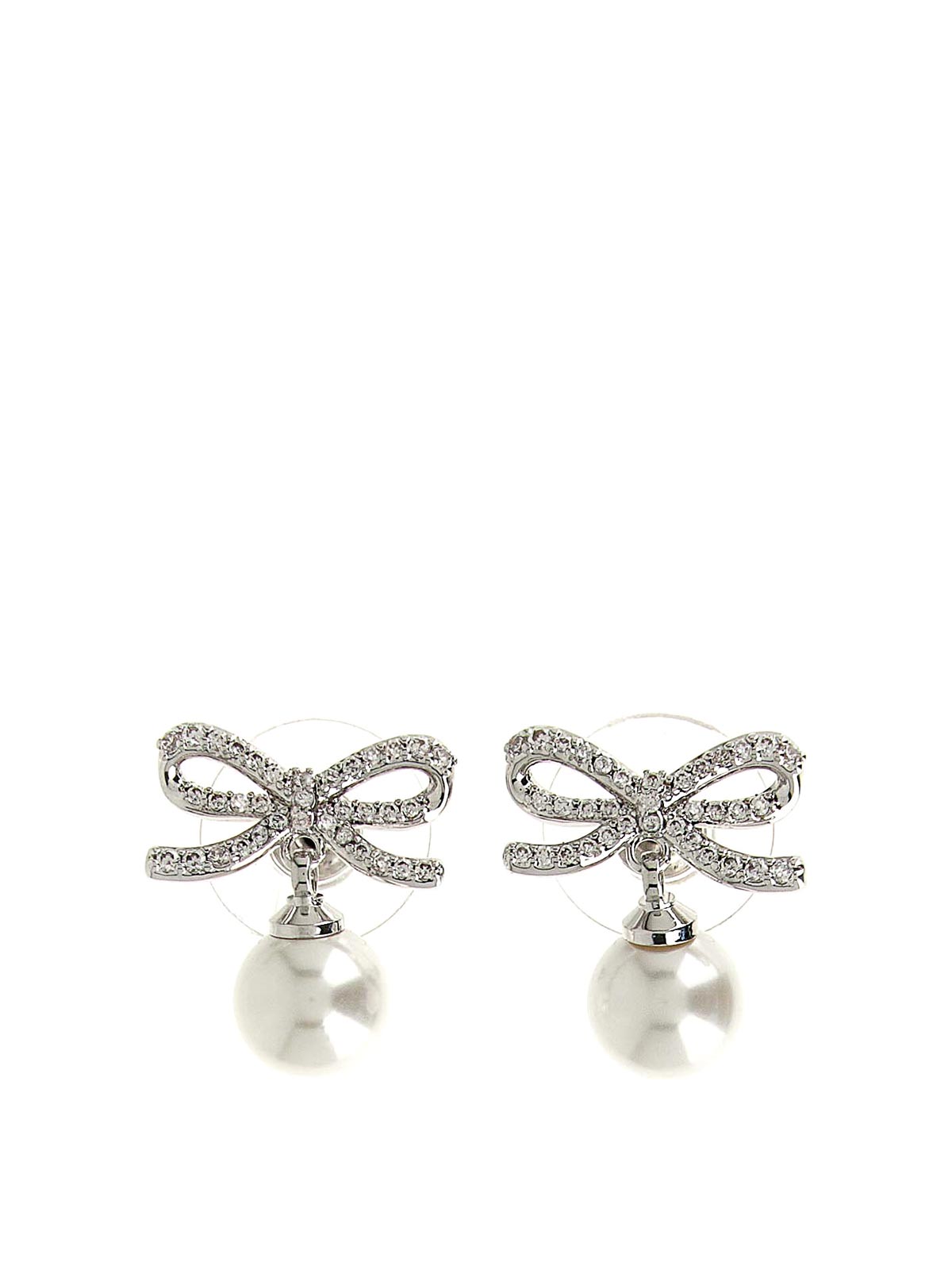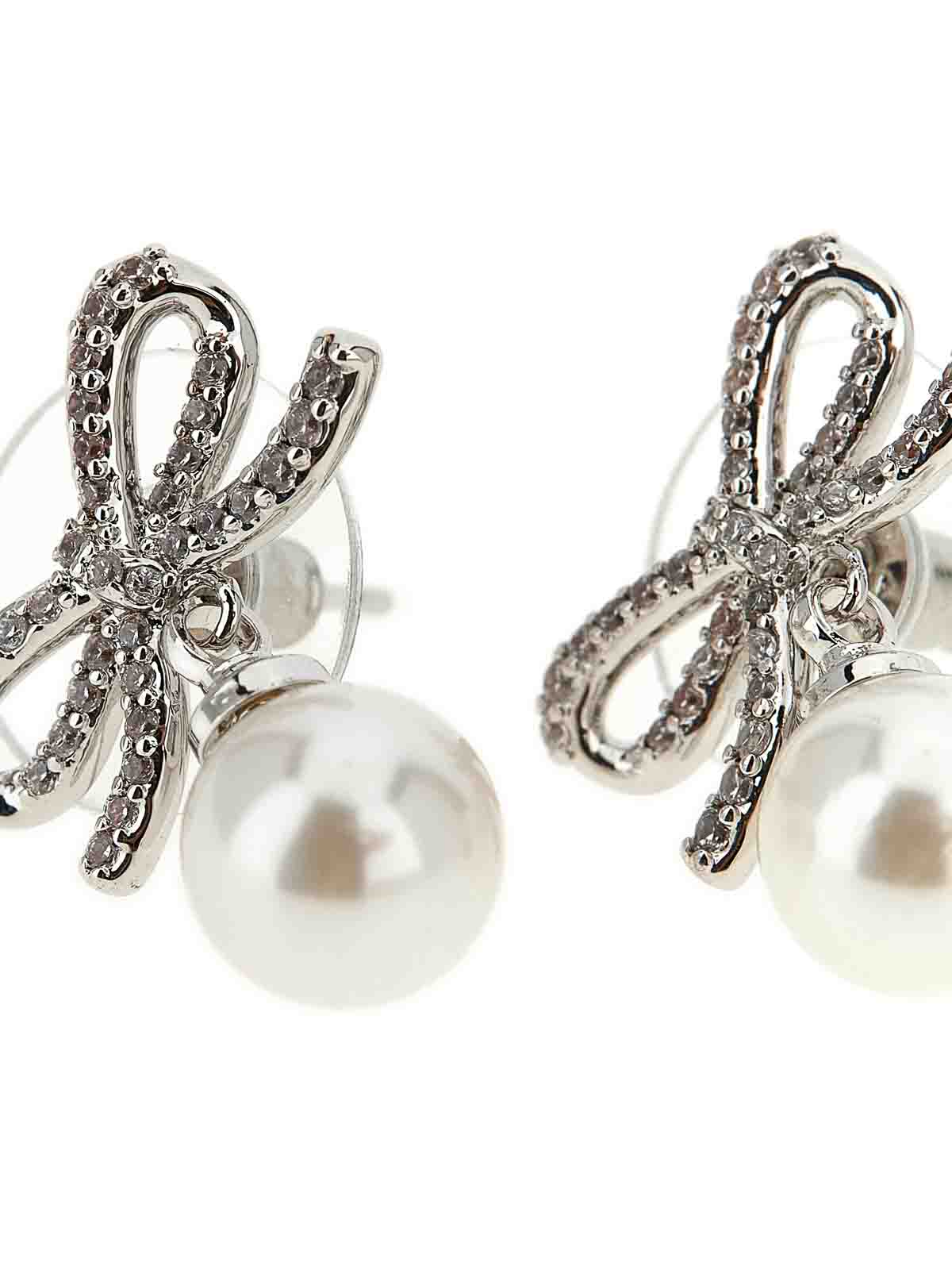 Schleifenperlenohrringe aus Metall und Kristallen, bogenförmiges Modell mit Perlenanhänger, Knopfverschluss. Artikel kann nicht zurückgegeben werden