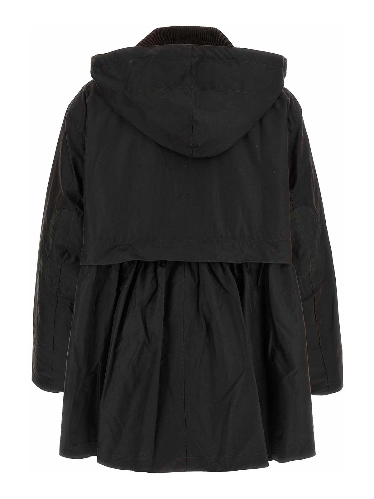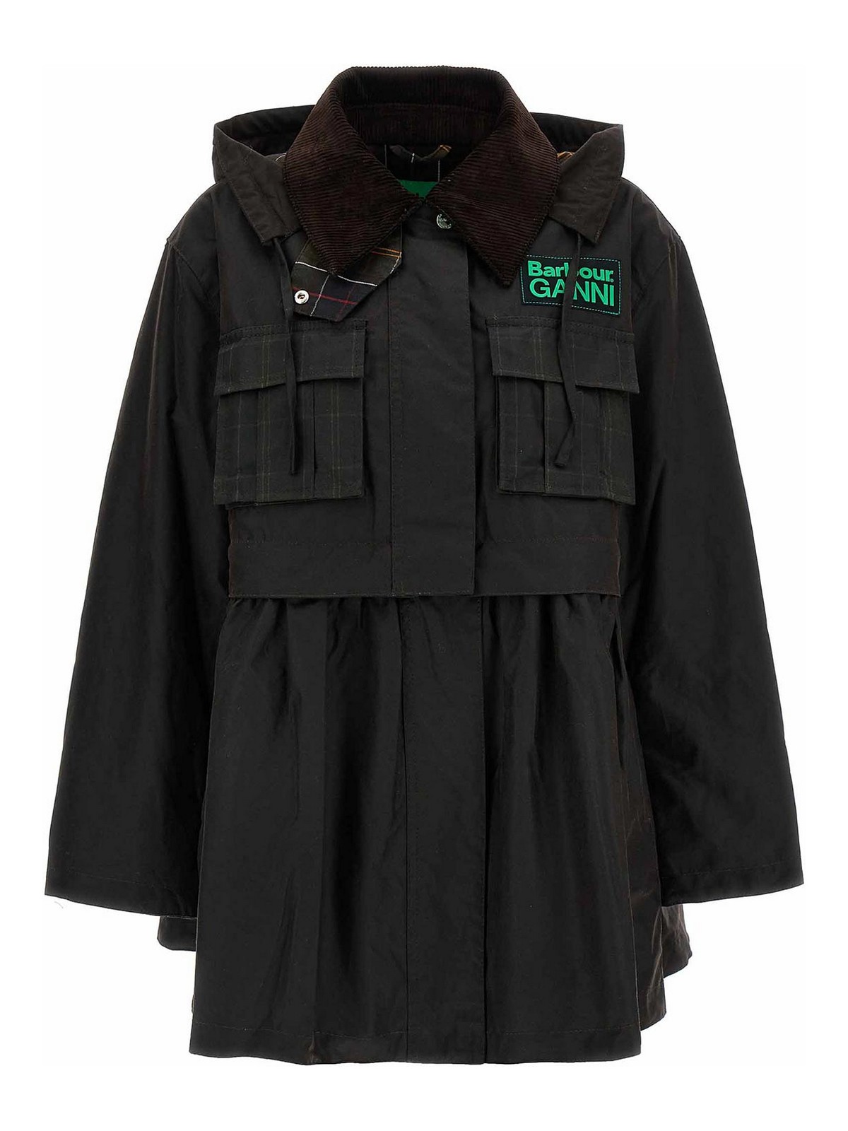 Barbour x Ganni Parka aus gewachster Baumwolle mit abnehmbarer Kapuze, Cordkragen, Frontreißverschluss, Reißverschluss an der Taille zur Längenregulierung, aufgesetzten Fronttaschen und Patches an den Ärmeln mit Karomuster. Ärmeln.