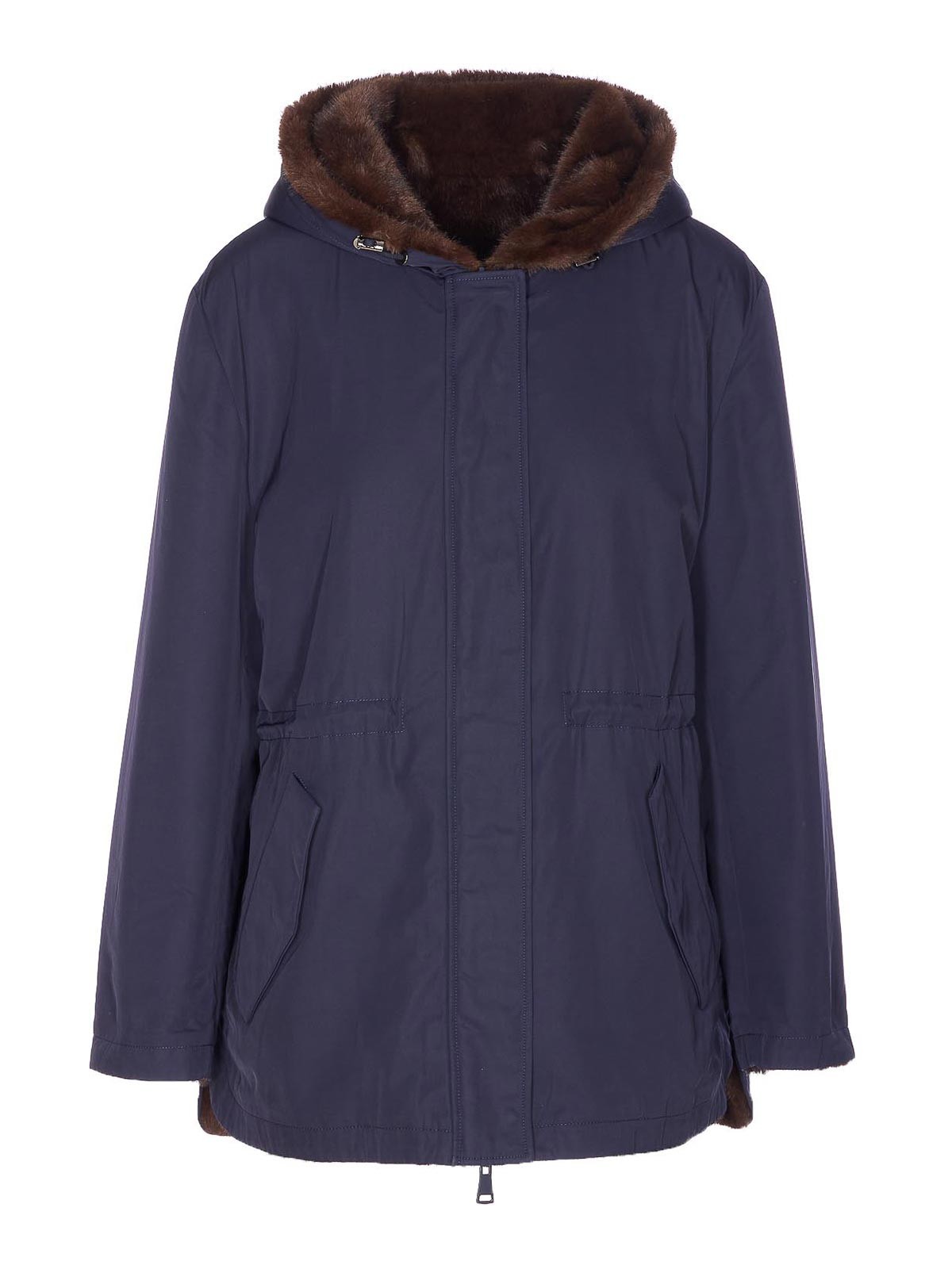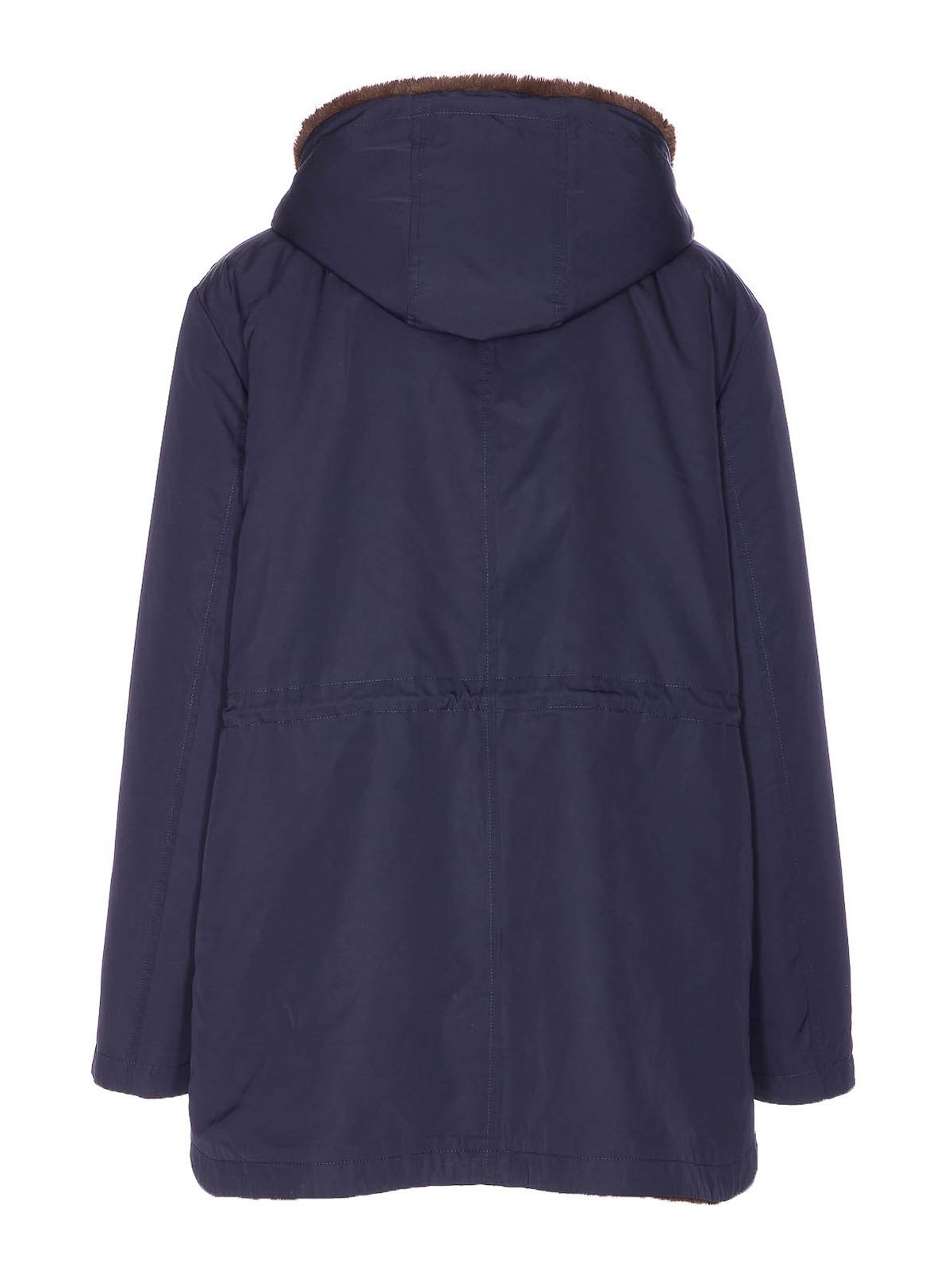 Lou Andrea Wendejacke in Blau und Braun mit frontalem Reißverschluss, langen Ärmeln, Taschen mit Knopfverschluss, Kapuzendetail