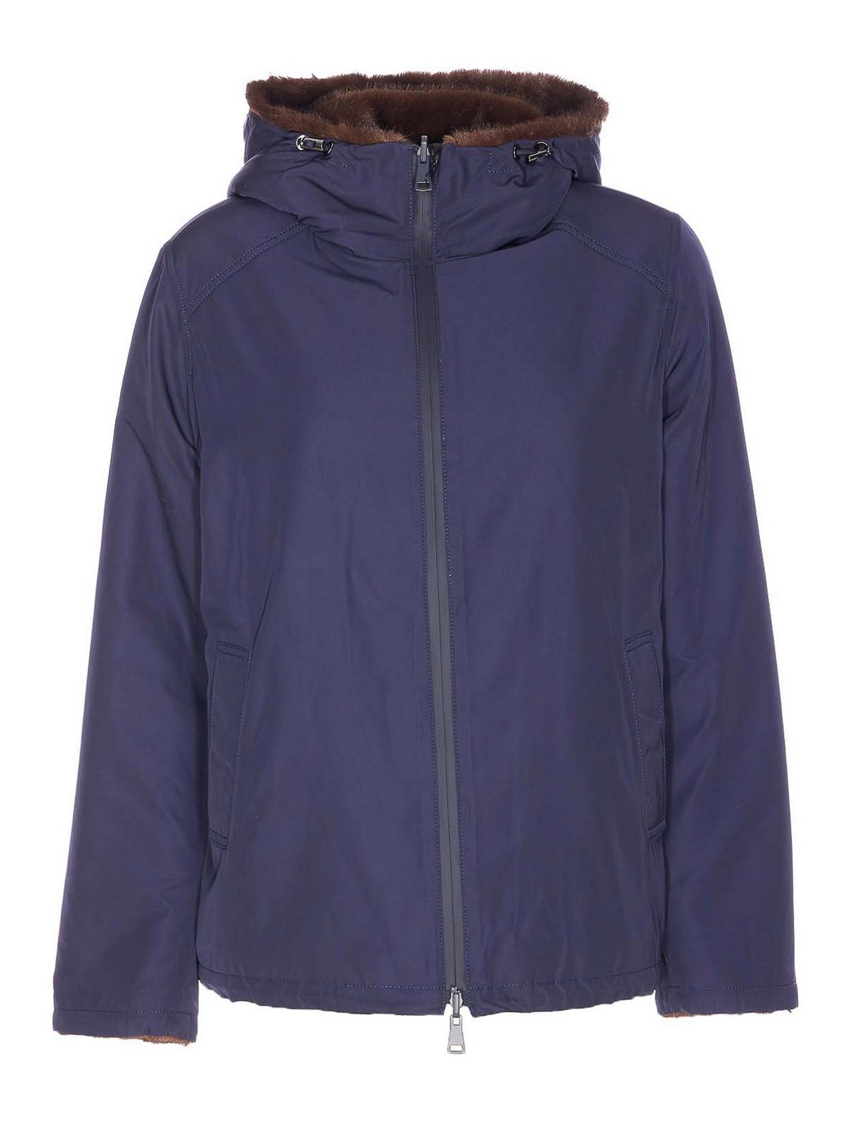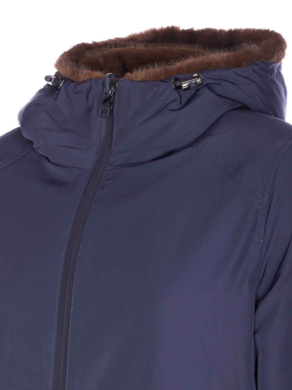 Lou Andrea blaue Wendejacke mit frontalem Reißverschluss, Kapuzendetail, langen Ärmeln, Taschen mit Knopfverschluss, eine Seite mit Kunstfell, Seitentaschen
