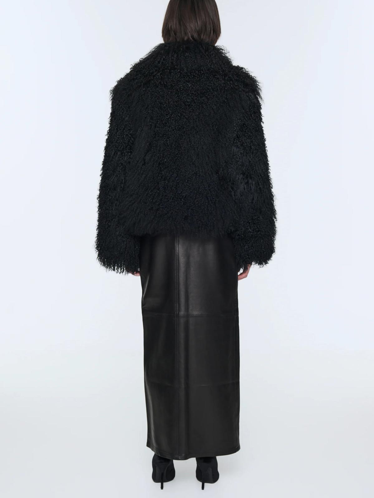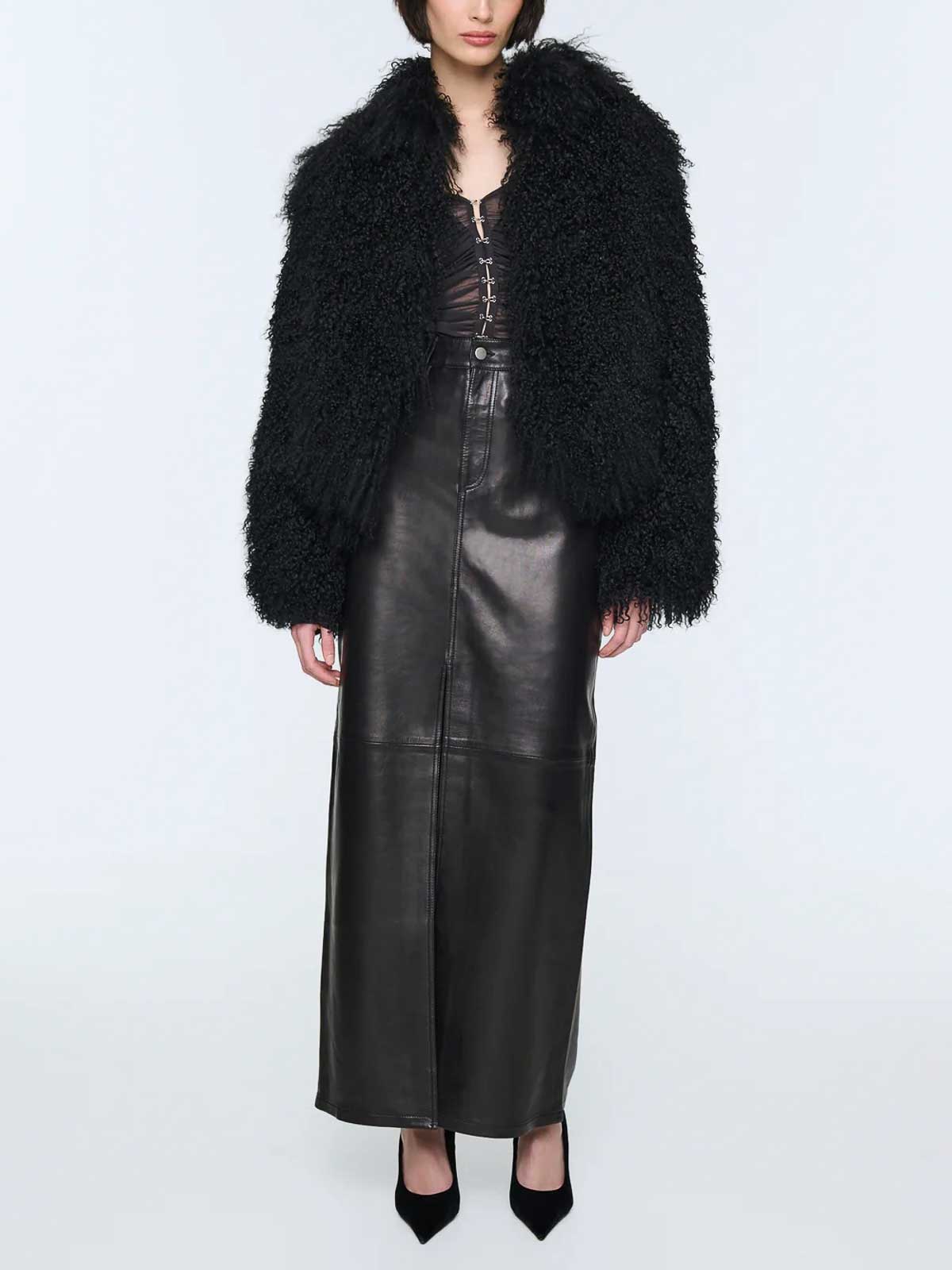 Designer-Farbe: Schwarz, mongolisches Lammfell, Lammfell, tailliertes Design, verdeckter Frontverschluss, lockiger Abschluss, lange Ärmel, gerader Saum.