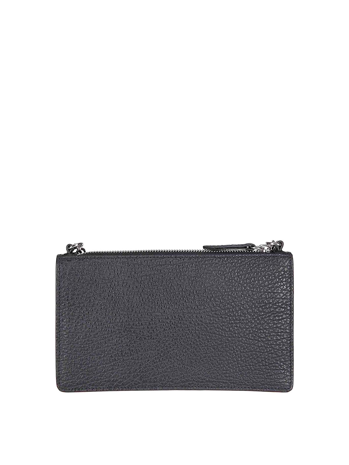 Kartenetui aus schwarzem genarbtem Leder, abnehmbarer Schulterriemen, Reißverschluss und Kreditkartenfach im Inneren.