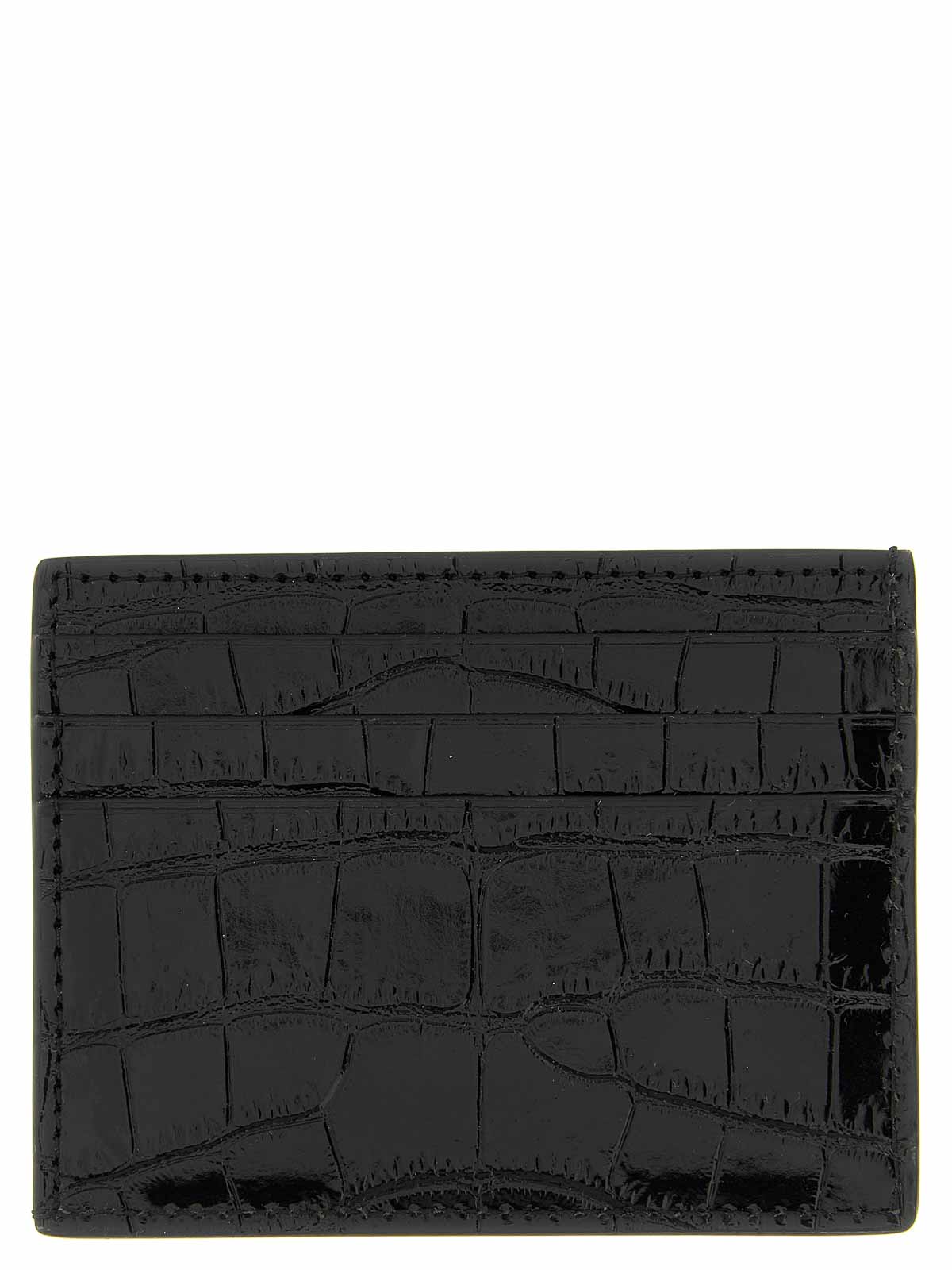 Kartenetui aus glänzendem Leder mit Krokoprint, geprägtem Logo auf der Vorderseite und zusätzliches Mittelfach.