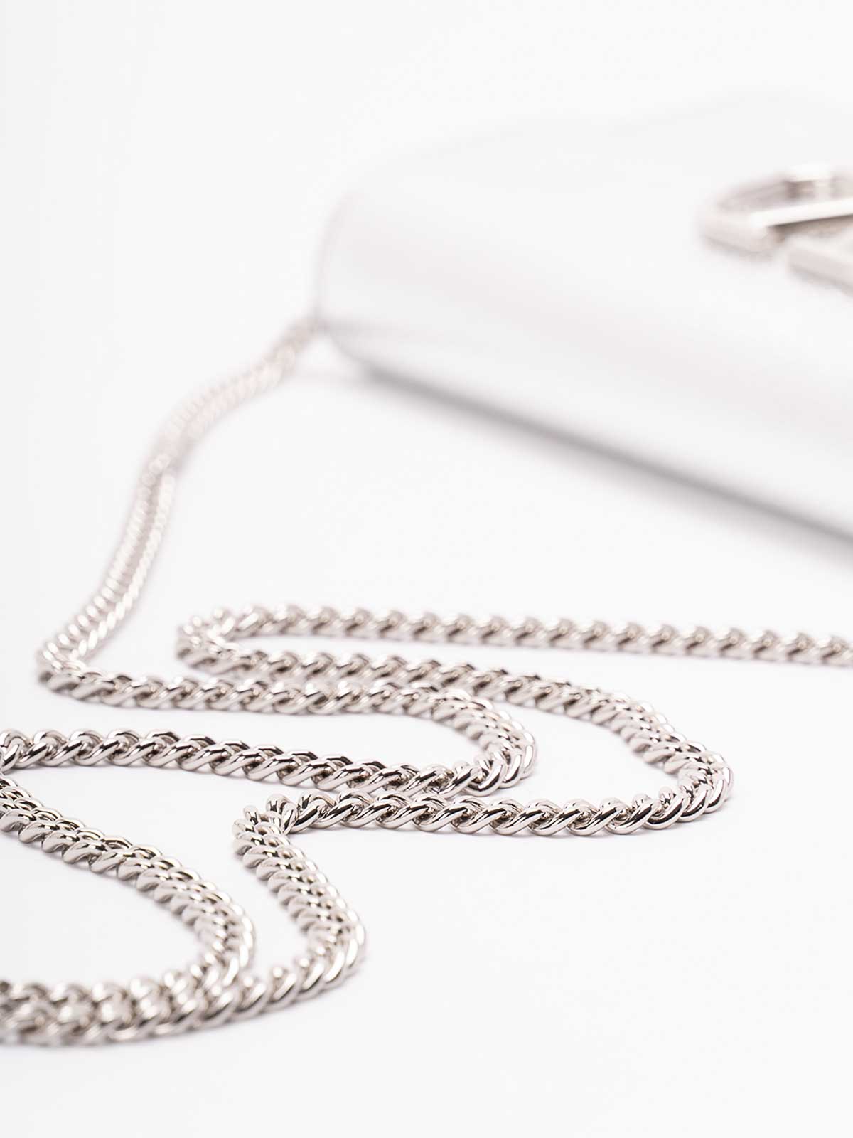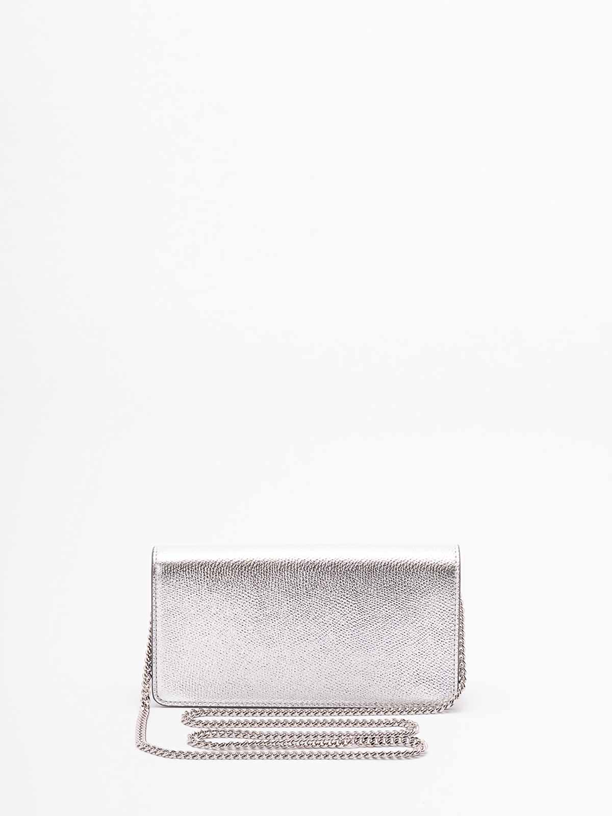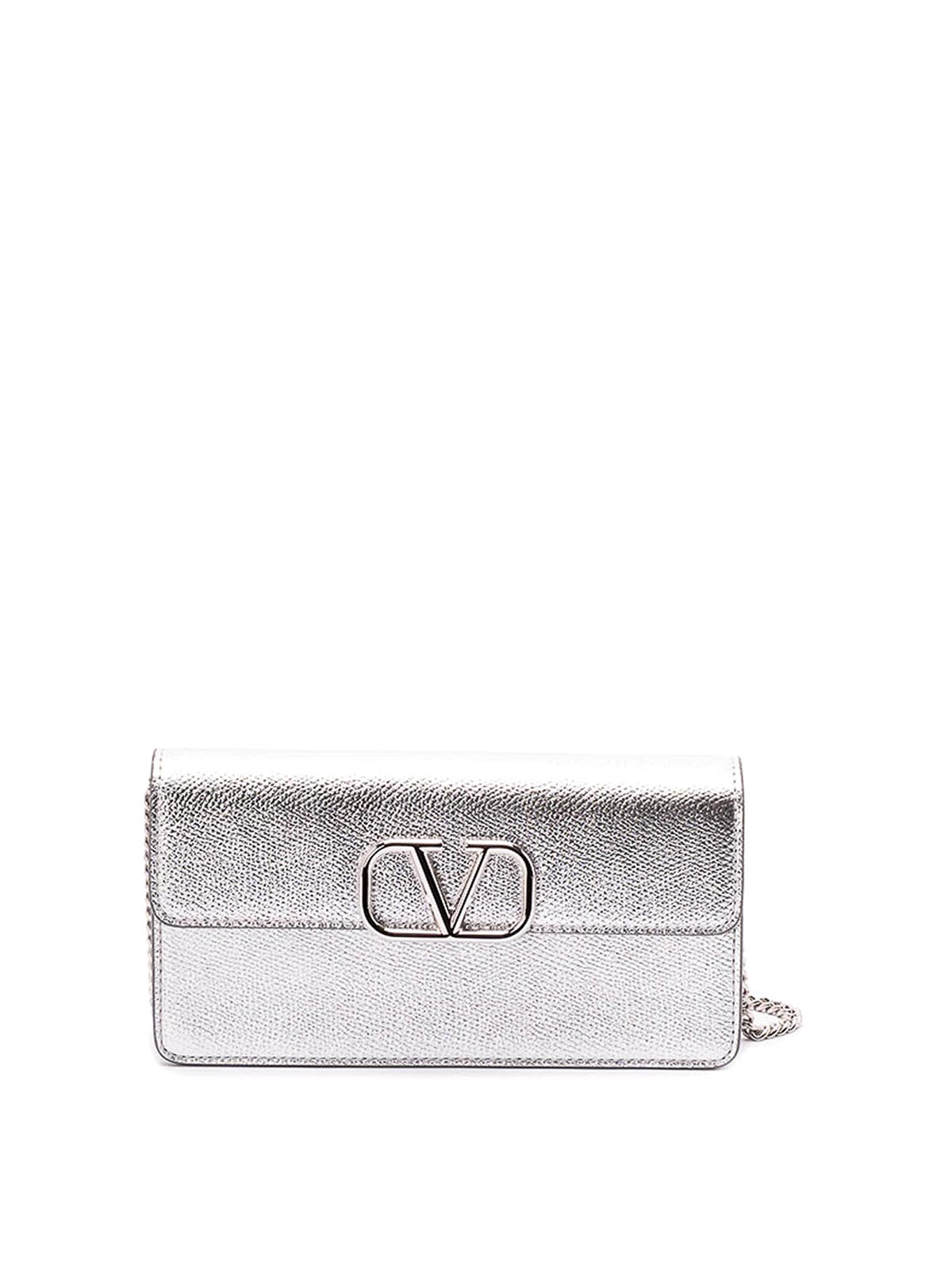 Geldbörse mit Riemen VLogo Signature aus metallischem Leder, gekennzeichnet durch eine abnehmbare Kette, mit der sie an der Schulter getragen werden kann. Die silberne Farbe unterstreicht die elegante und zeitgemäße Ästhetik des Modells.