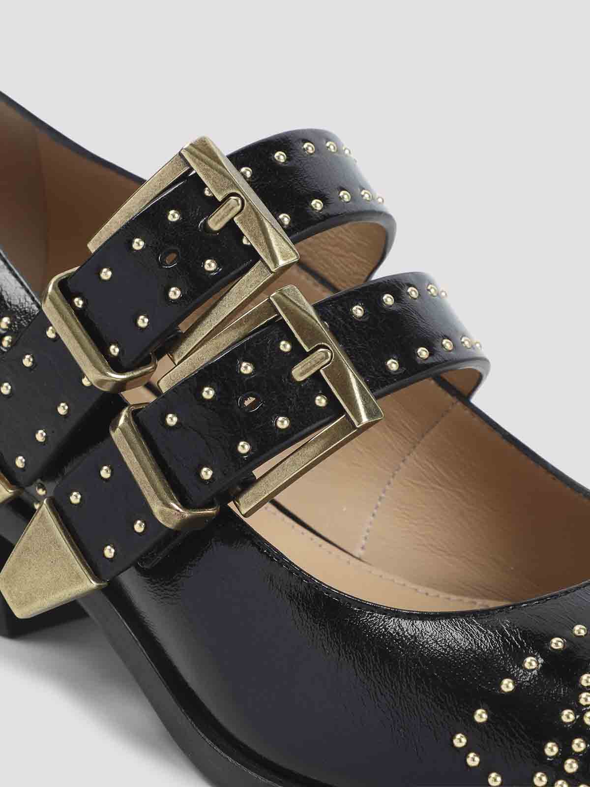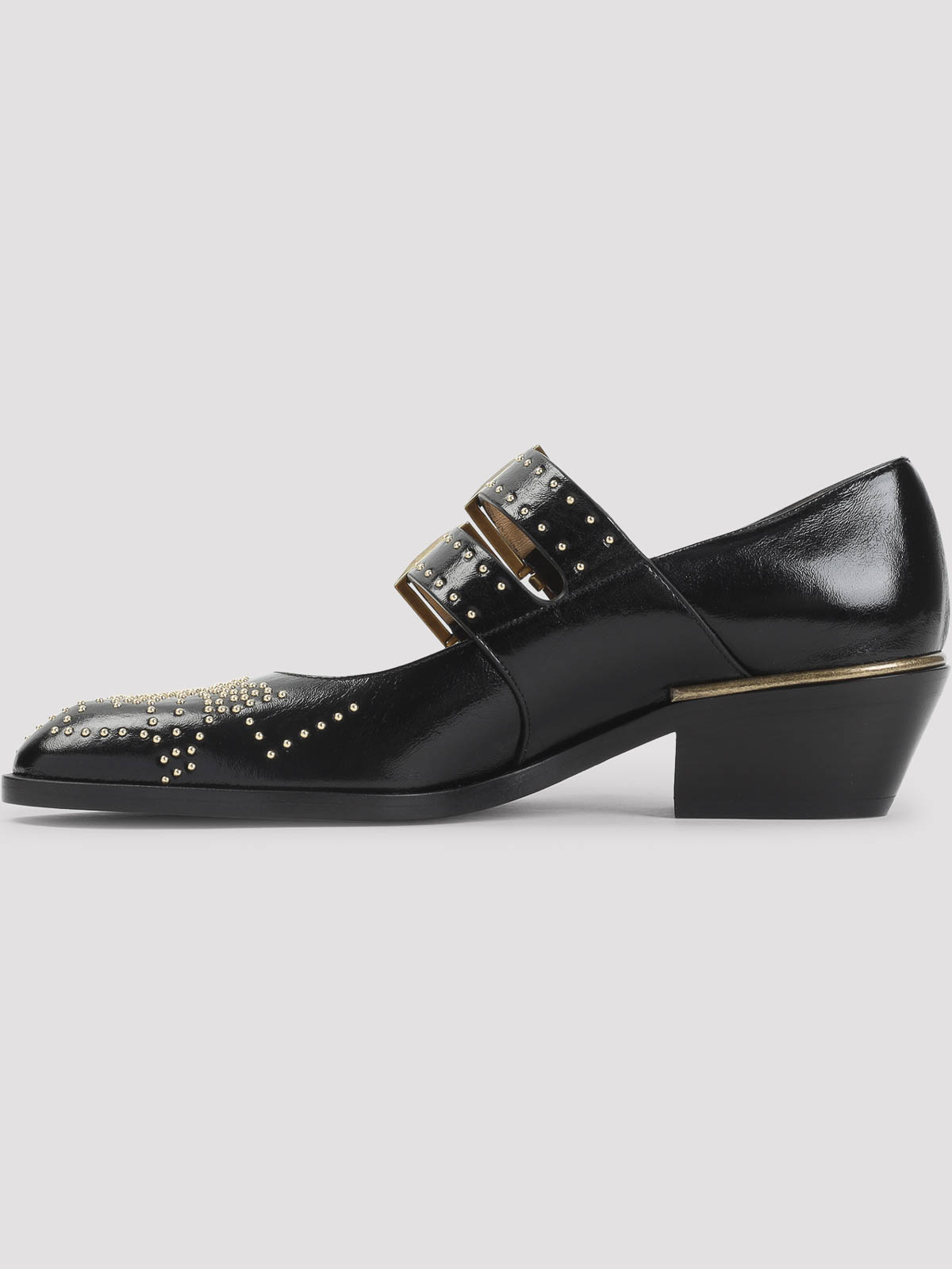 Schwarze Susan-Pumps aus Kalbsleder von Chloe. Pumps aus reinem schwarzem Kalbsleder, Zehenpartie in Mandelform, verstellbare Riemen an der Oberseite mit Metallschnalle, breiter schwarzer Absatz, tonale Sohle. Nietendetails aus goldfarbenem Messing auf dem Obermaterial.