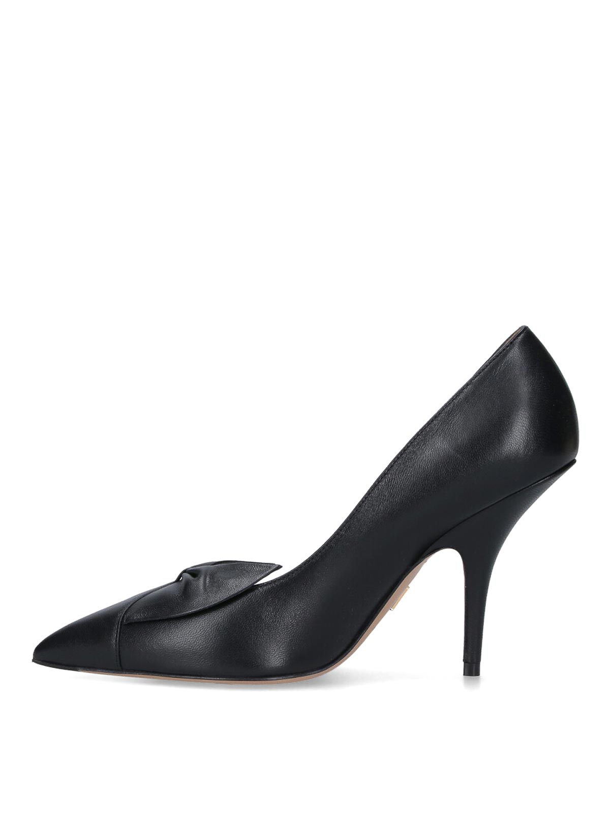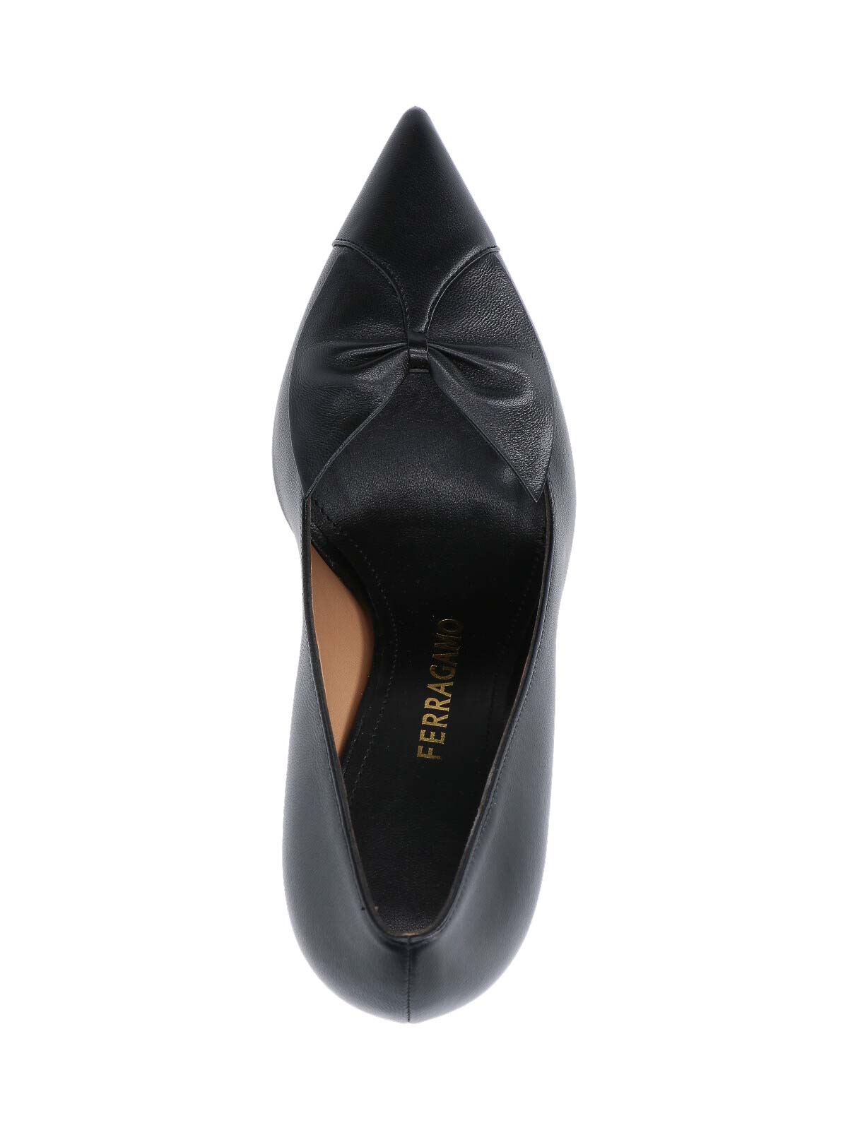 Ferragamo Pumps mit Schleife, aus schwarzem Lammleder, spitzer Zehenbereich, farblich abgestimmtes Obermaterial mit Schleifendetail, Stilettoabsatz, Slip-On-Passform, Ledersohle.