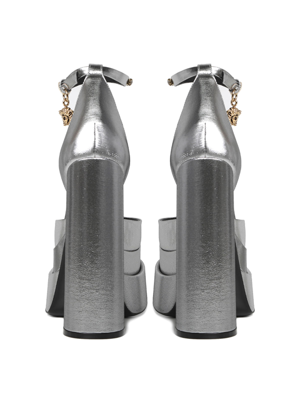 Medusa-Anhänger, Knöchelriemen, mit Kristallen geschmückt, Medusa-Anhänger, quadratische Spitze, doppelte Plateauform